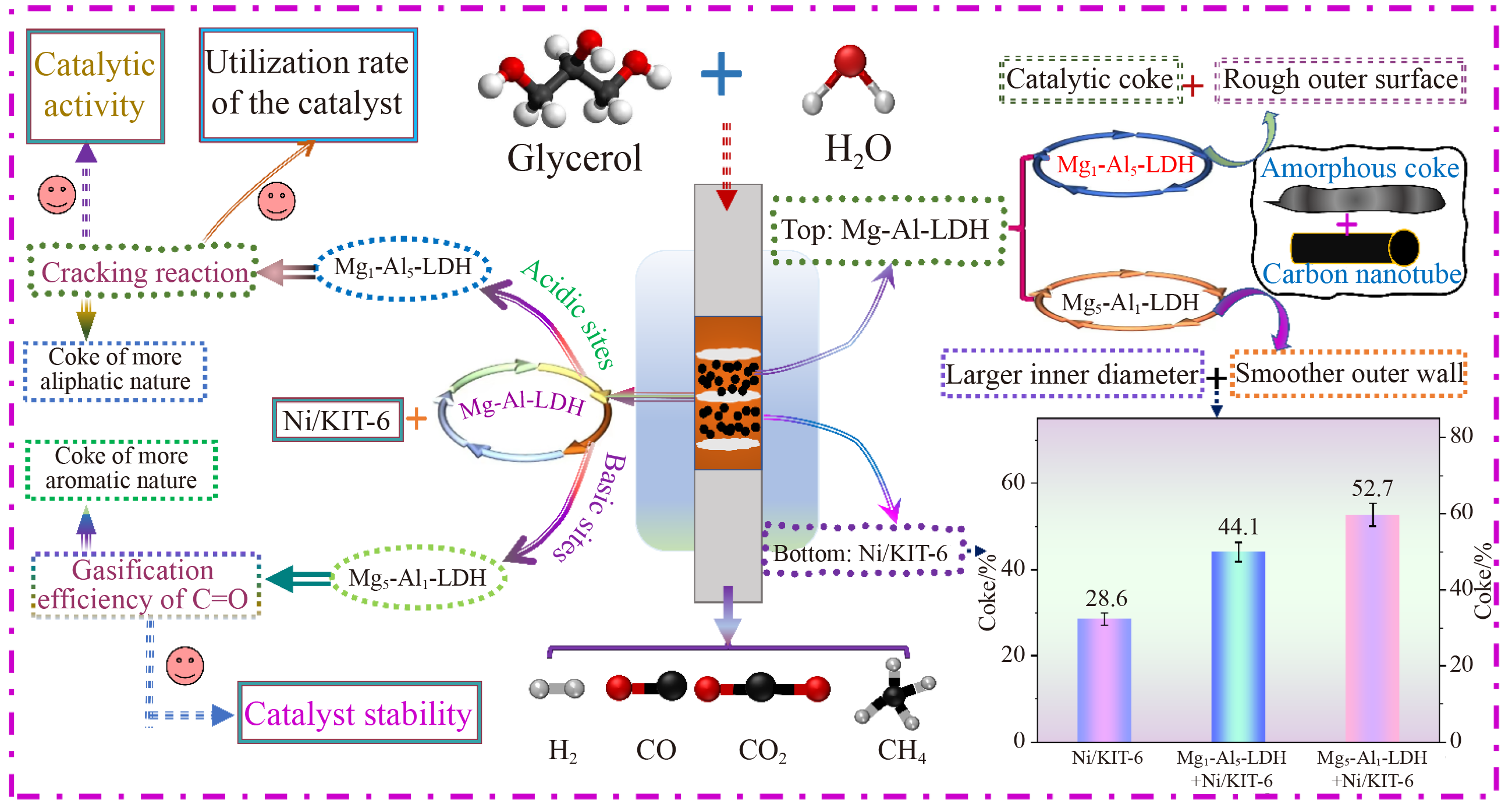 During steam reforming, the performance of a catalyst and amount/property of coke are closely related to reaction intermediates reaching surface of a catalyst. Herein, modification of reaction intermediates by placing Mg-Al-hydrotalcite above Ni/KIT-6 catalyst in steam reforming of glycerol was conducted at 300 to 600 °C. The results revealed that the catalytic activity of Ni/KIT-6 in the lower bed was enhanced with either Mg1-Al5-hydrotalcite (containing more acidic sites) or Mg5-Al1-hydrotalcite (containing more alkaline sites) as upper-layer catalyst. The in situ infrared characterization of steam reforming demonstrated that Mg-Al-hydrotalcite catalyzed the deoxygenation of glycerol, facilitating the reforming of the partially deoxygenated intermediates over Ni/KIT-6. Mg-Al-hydrotalcite as protective catalyst, however, did not protect the Ni/KIT-6 from formation of more coke. Nonetheless, this did not lead to further deactivation of Ni/KIT-6 while Mg5-Al1-hydrotalcite even substantially enhanced the catalytic stability, even though the coke was much more significant than that in the use of single Ni/KIT-6 (52.7% vs. 28.6%). The reason beneath this was change of the property of coke from more aliphatic to more aromatic. Mg5-Al1-hydrotalcite catalyzed dehydration of glycerol, producing dominantly reaction intermediates bearing C=C, which formed the catalytic coke of with carbon nanotube as the main form with smooth outer walls as well as higher aromaticity, C/H ratio, crystallinity, crystal carbon size, thermal stability, and resistivity toward oxidation on Ni/KIT-6 in the lower bed. In comparison, the abundance of acidic sites on Mg1-Al5-hydrotalcite catalyzed the formation of more oxygen-containing species, leading to the formation of carbon nanotubes of rough surface on Ni/KIT-6.