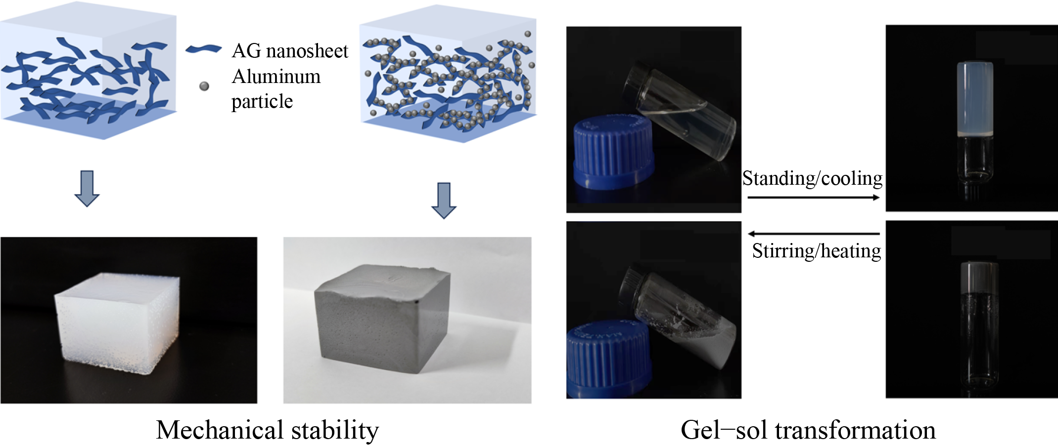 The aluminum-water system is a promising propellant due to high energy and low signal characteristics, and the gel form is easier to store and utilize. In this work, hydrogels of water and aluminum particles were prepared using the low-molecular-weight gellant agarose. The various physical properties of gel systems, including the water loss rate, phase transition temperature, and centrifugal stability at different gellant and aluminum contents, were examined. Rheological properties were assessed through shear thinning tests, thixotropy tests, strain sweep analysis, and frequency sweep experiments. The microstructure of the gel was obtained through scanning electron microscopy images. The results show that the aluminum-hydrogel network structure is composed of micron-scale aluminum and agarose nanosheets, and the unique micro-nanostructure endows the gel with excellent mechanical strength and thermal stability, which improve with increasing gellant and aluminum contents. Notably, the gel with 2% agarose and 20% aluminum had the best performance; the storage modulus reached 90647 Pa, which was within the linear viscoelastic region, and the maximum withstand pressure was 111.2 kPa, which was 118.8% greater than that of the pure hydrogel. Additionally, the gel demonstrates remarkable shear thinning behavior and can undergo gel-sol transformation upon shearing or heating to exceeding 114 °C.