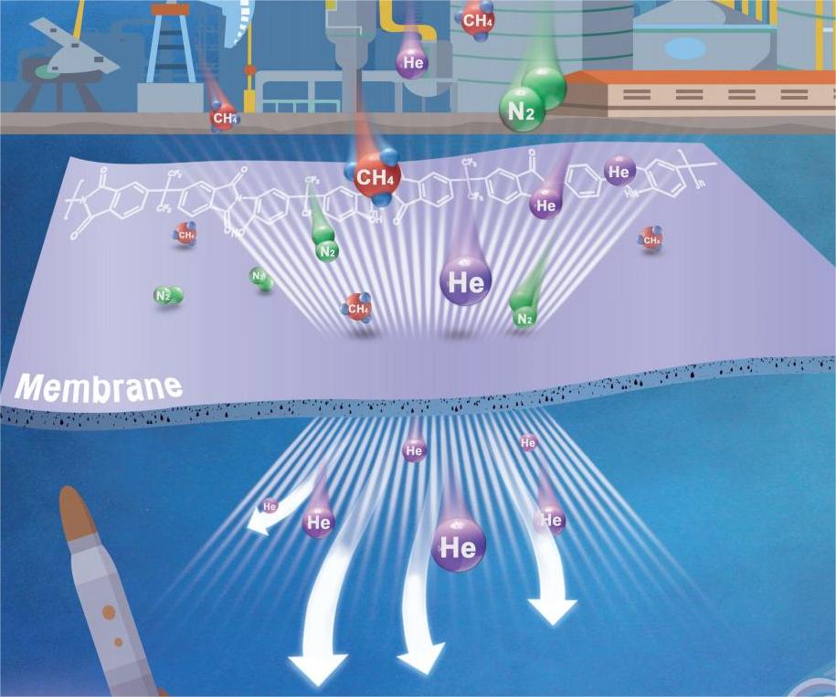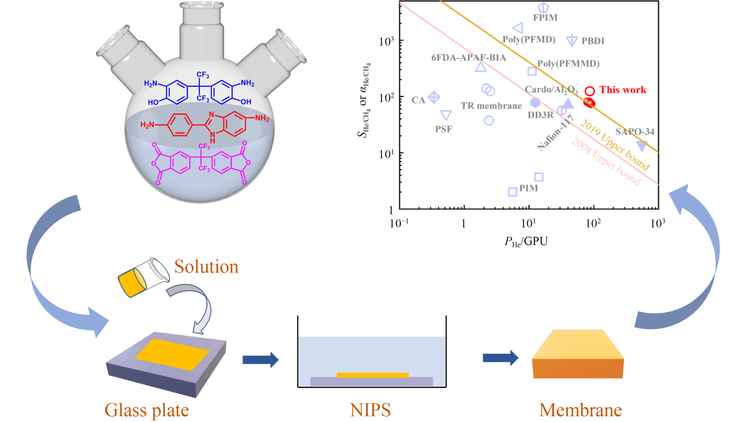 Membrane gas separation is considered an energy-saving technique to extract He from natural gas due to no phase change and room temperature operation. However, the membrane performance was strongly limited by the trade-off between permeance and selectivity. Herein, novel 4,4′-(hexafluoroisopropylidene)diphthalic anhydride (6FDA)-2,2′-bis(3-amino-4-hydroxyphenyl)hexafluoropropane (APAF)-5-amino-2-(4-aminobenzene)benzimidazole (BIA) asymmetric membranes with a thickness of 300 nm were successfully prepared by the non-solvent induced phase separation method. The membrane performance was modulated by regulating dope solution compositions (e.g., tetrahydrofuran and polymer concentration). The ideal He/CH4 selectivity was 124 and the optimized He permeance reached 87 GPU, beyond the current upper bound. He/CH4 selectivity was 75 and He permeance was 73 GPU for the binary mixture feed containing 0.2 mol % He. The membrane showed good resistance to CO2 and C2H6, which are the typical impurities in natural gas. The 6FDA-APAF-BIA membranes have good stability (> 160 h), which can provide great potential in He extraction from natural gas.