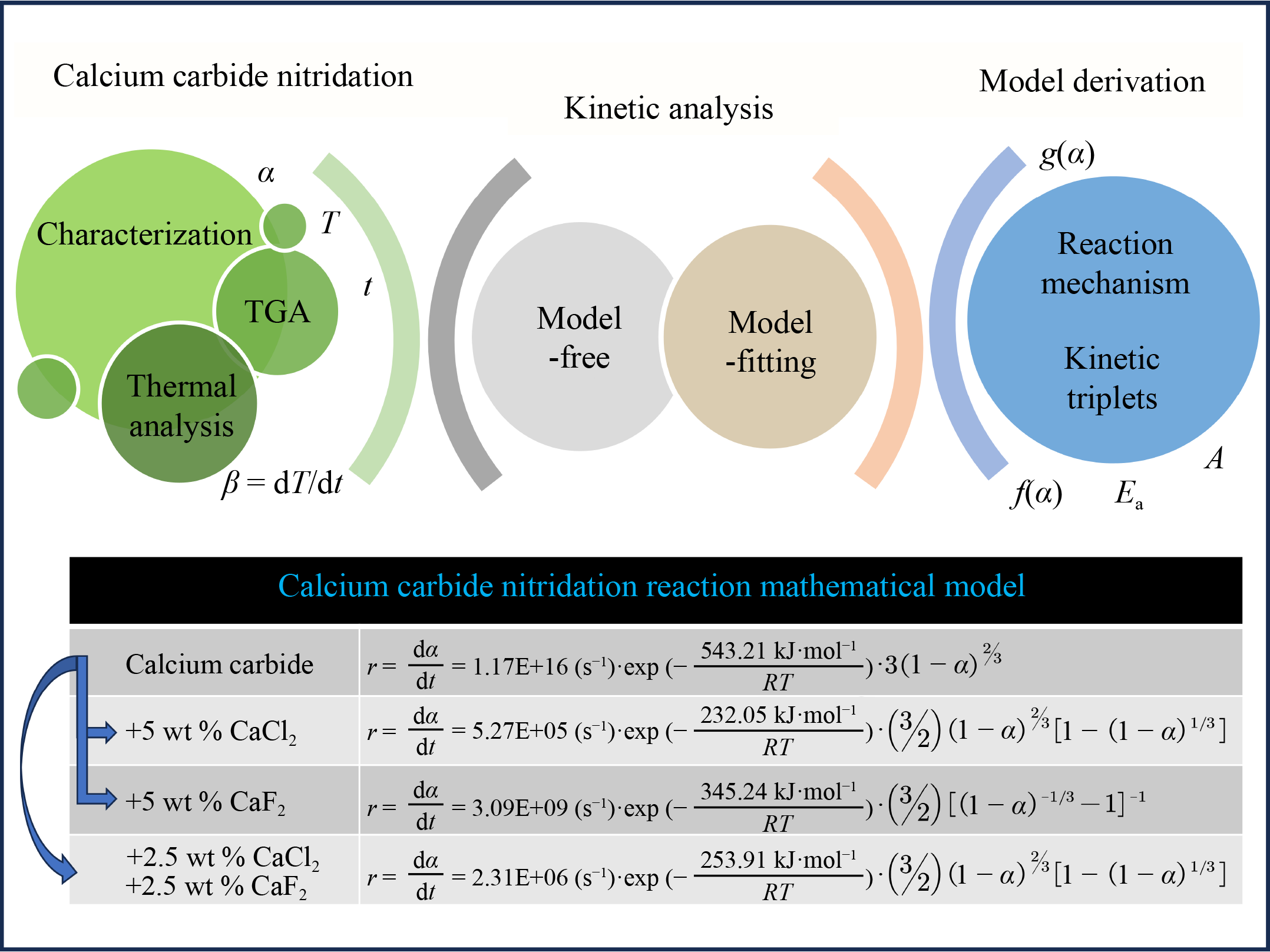 The nitridation reaction of calcium carbide and N2 at high temperatures is the key step in the production of lime-nitrogen. However, the challenges faced by this process, such as high energy consumption and poor product quality, are mainly attributed to the lack of profound understanding of the reaction. This study aimed to improve this process by investigating the non-isothermal kinetics and reaction characteristics of calcium carbide nitridation reaction at different heating rates (10, 15, 20, and 30 °C·min−1) using thermogravimetric analysis. The kinetic equation for the nitridation reaction of additive-free calcium carbide sample was obtained by combining model-free methods and model-fitting method. The effect of different calcium-based additives (CaCl2 and CaF2) on the reaction was also investigated. The results showed that the calcium-based additives significantly reduced reaction temperature and activation energy Ea by about 40% with CaF2 and by 55%–60% with CaCl2. The reaction model f(α) was also changed from contracting volume (R3) to 3-D diffusion models with D3 for CaCl2 and D4 for CaF2. This study provides valuable information on the mechanism and kinetics of calcium carbide nitridation reaction and new insights into the improvement of the lime-nitrogen process using calcium-based additives.
