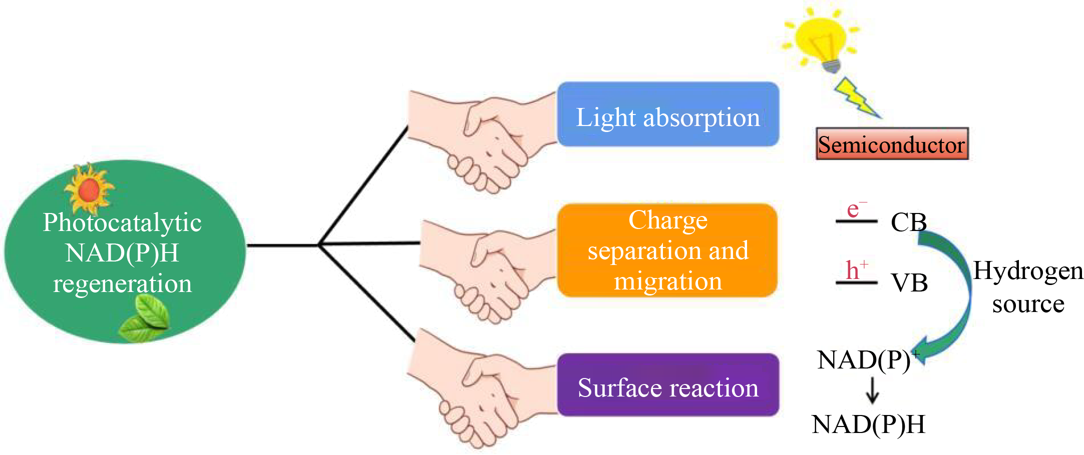 Download coverThe enzymatic redox reactions in natural photosynthesis rely much on the participation of cofactors, with reduced nicotinamide adenine dinucleotide/nicotinamide adenine dinucleotide phosphate (NADH/NADPH) or their oxidized form (NAD+/NADP+) as an important redox power. The photocatalytic regeneration of expensive and unstable NADH/NADPH in vitro is an important process in enzymatic reduction and has attracted much research attention. Though different types of photocatalysts have been developed for photocatalytic NADH/NADPH regeneration, the efficiency is still relatively low. To elucidate the key factors affecting the performance of photocatalytic NADH/NADPH regeneration is helpful to rationally design the photocatalyst and improve the photocatalytic efficiency. In this paper, we overview the recent progress in photocatalytic NADH/NADPH regeneration with the focus on the strategies to improve the visible light adsorption, the charge separation and migration efficiency, as well as the surface reaction, which jointly determine the overall photocatalytic regeneration efficiency. The potential development of photocatalytic NADH/NADPH regeneration and photocatalytic-enzymatic-coupling system is prospected finally.