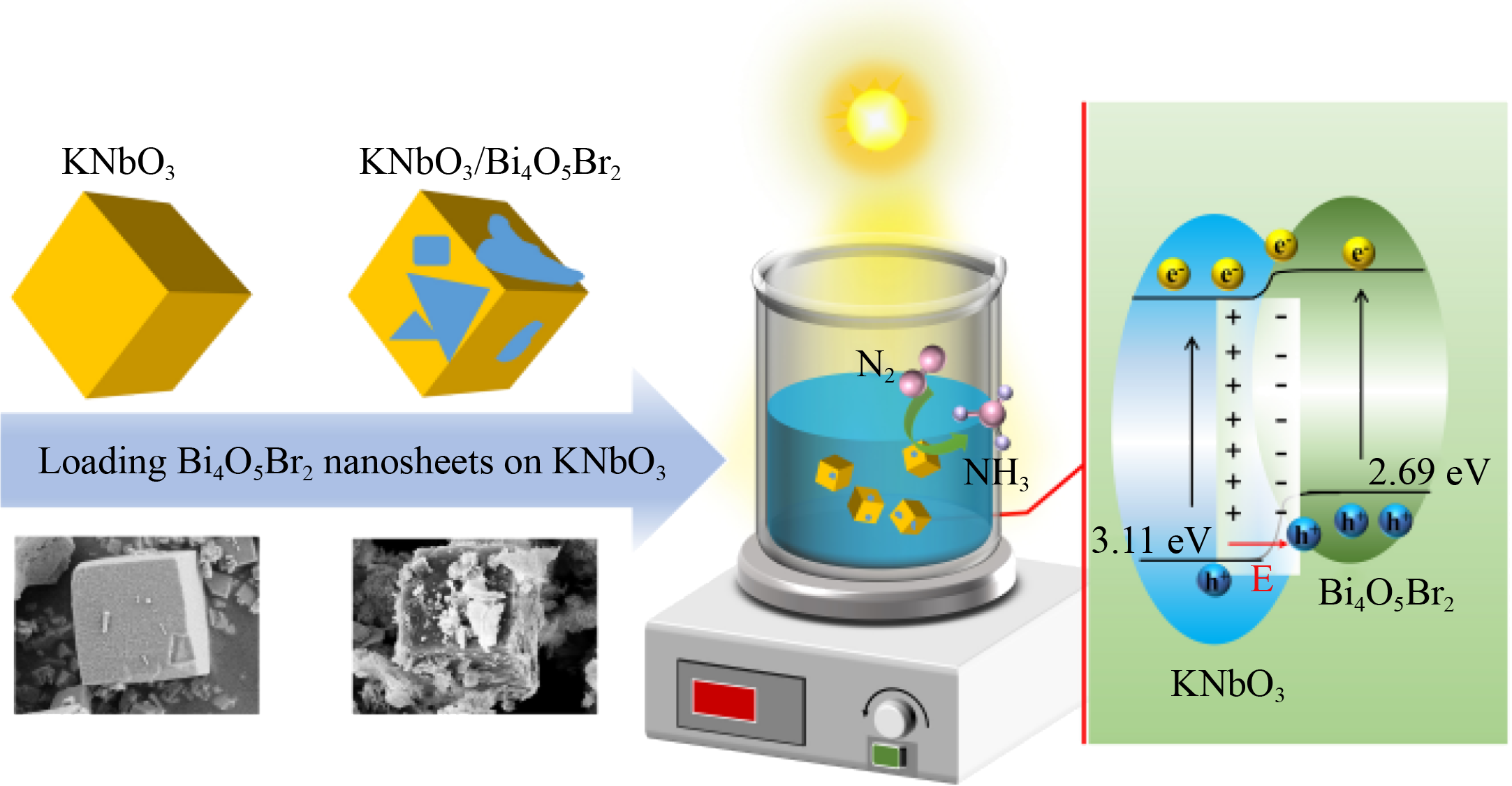 The fabrication of heterojunction catalysts is an effective strategy to enhance charge separation efficiency, thus boosting the performance of photocatalysts. This work presents the synthesis and investigation of a novel KNbO3/Bi4O5Br2 heterostructure catalyst for photocatalytic N2–to–NH3 conversion under light illumination. While morphology analysis revealed KNbO3 microcubes embedded within Bi4O5Br2 nanosheets, the composite exhibited no significant improvement in specific surface area or optical property compared to Bi4O5Br2 due to the relatively wide band gap and low surface area of KNbO3. The main contribution lies in the enhanced separation efficiency of photogenerated electrons and holes. Besides, the band structure analysis suggests that KNbO3 and Bi4O5Br2 exhibit suitable band potentials to form a type II heterojunction. Benefiting from the higher Fermi level of KNbO3 than Bi4O5Br2, the electron drift at the contact region thus occurs and leads to the formation of a built-in electric field with the direction from KNbO3 to Bi4O5Br2, accelerating electron migration and improving the operational efficiency of the photocatalysts. Consequently, the KNbO3/Bi4O5Br2 catalyst shows an increased photoactivity, achieving an NH3 generation rate 1.78 and 1.58 times those of KNbO3 and Bi4O5Br2, respectively. This work may offer valuable insights for the design and synthesis of heterojunction composite photocatalysts.