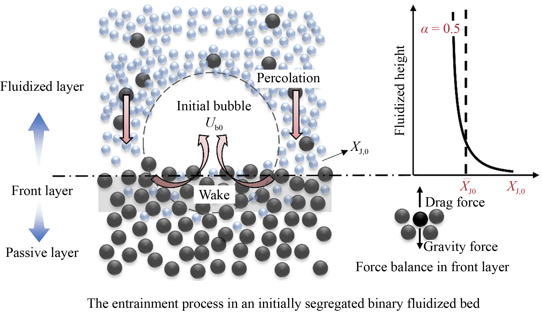 Particle segregation and mixing behavior play a crucial role in industrial processes. This study investigates the saturated jetsam fraction, which indicates the maximum capacity of flotsam to entrain jetsam, in an initially separated binary fluidized bed with particle size differences. According to the value of saturated jetsam fraction, three distinct regimes—segregation, mixing, and an intermediate regime—are identified. Moreover, intriguing relationships between the saturated jetsam fraction and superficial gas velocity are observed, exhibiting monotonic trends in both the segregation and mixing regimes, while a unique volcano-shaped curve in the intermediate regime. Additionally, a comprehensive entrainment model based on two-fluid model elucidates the observed phenomena, emphasizing the significance of mixing behavior in fluidized layer on the saturated jetsam fraction. This work offers potential insights for evaluating segregation in industrial applications.