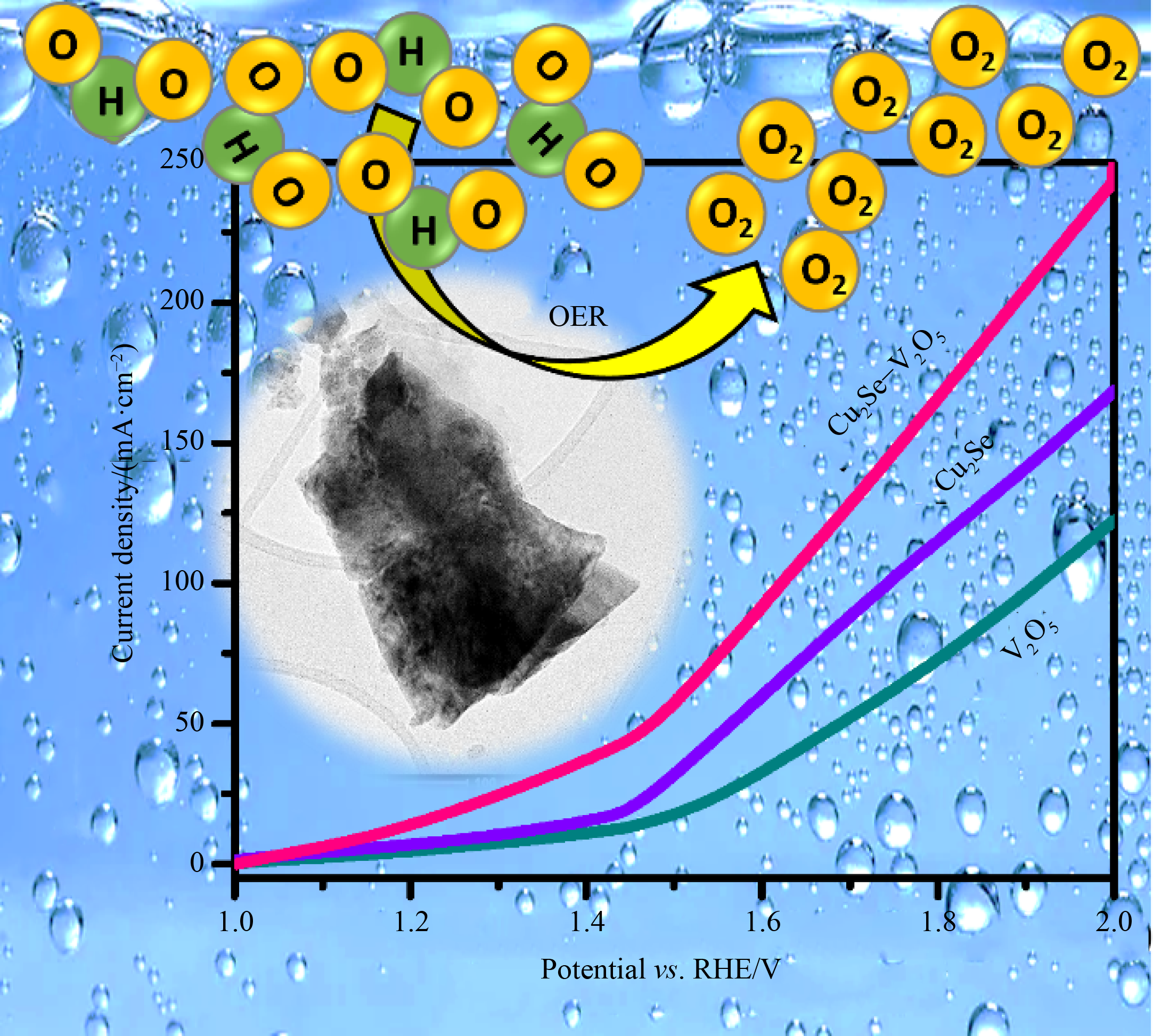Reducing the production costs of clean energy carriers such as hydrogen through scalable water electrolysis is a potential solution for advancing the hydrogen economy. Among the various material candidates, our group demonstrated transition-metal-based materials with tunable electronic characteristics, various phases, and earth-abundance. Herein, electrochemical water oxidation using Cu2Se–V2O5 as a non-precious metallic electrocatalyst via a hydrothermal approach is reported. The water-splitting performance of all the fabricated electrocatalysts was evaluated after direct growth on a stainless-steel substrate. The electrochemically tuned Cu2Se–V2O5 catalyst exhibited a reduced overpotential of 128 mV and provided a reduced Tafel slope of 57 mV·dec–1 to meet the maximum current density of 250 mA·cm–2. The optimized strategy for interfacial coupling of the fabricated Cu2Se–V2O5 catalyst resulted in a porous structure with accessible active sites, which enabled adsorption of the intermediates and afforded an effective charge transfer rate for promoting the oxygen evolution reaction. Furthermore, the combined effect of the catalyst components provided long-term stability for over 110 h in an alkaline solution, which makes the catalyst promising for large-scale practical applications. The aforementioned advantages of the composite catalyst overcome the limitations of low conductivity, agglomeration, and poor stability of the pure catalysts (Cu2Se and V2O5).