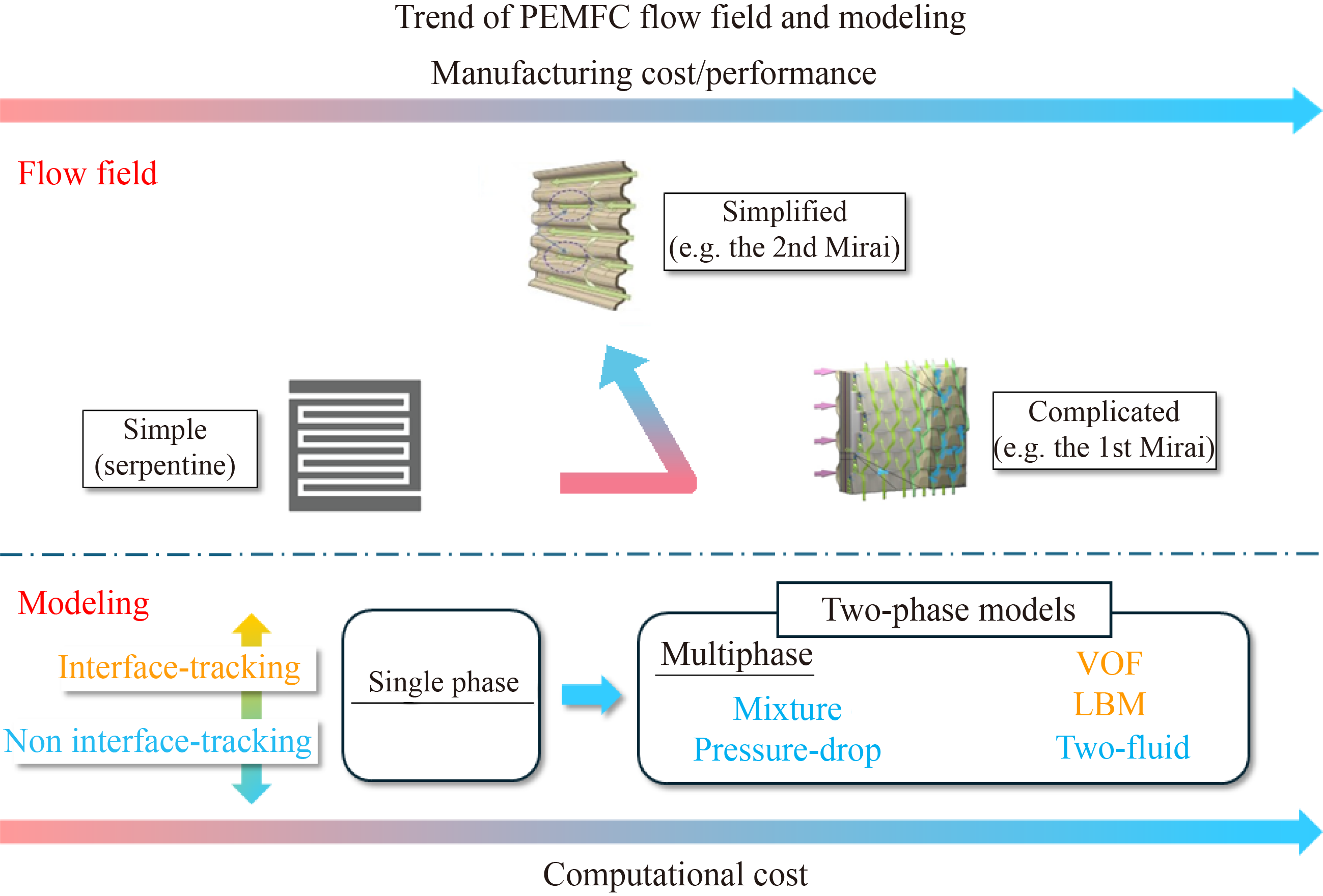 Reactant gas and liquid water transport phenomena in the flow channels are complex and critical to the performance and durability of polymer electrolyte membrane fuel cells. The polymer membrane needs water at an optimum level for proton conductivity. Water management involves the prevention of dehydration, waterlogging, and the cell’s subsequent performance decline and degradation. This process requires the study and understanding of internal two-phase flows. Different experimental visualization techniques are used to study two-phase flows in polymer electrolyte membrane fuel cells. However, the experiments have limitations in in situ measurements; they are also expensive and time exhaustive. In contrast, numerical modeling is cheaper and faster, providing insights into the complex multiscale processes occurring across the components of the polymer electrolyte membrane fuel cells.