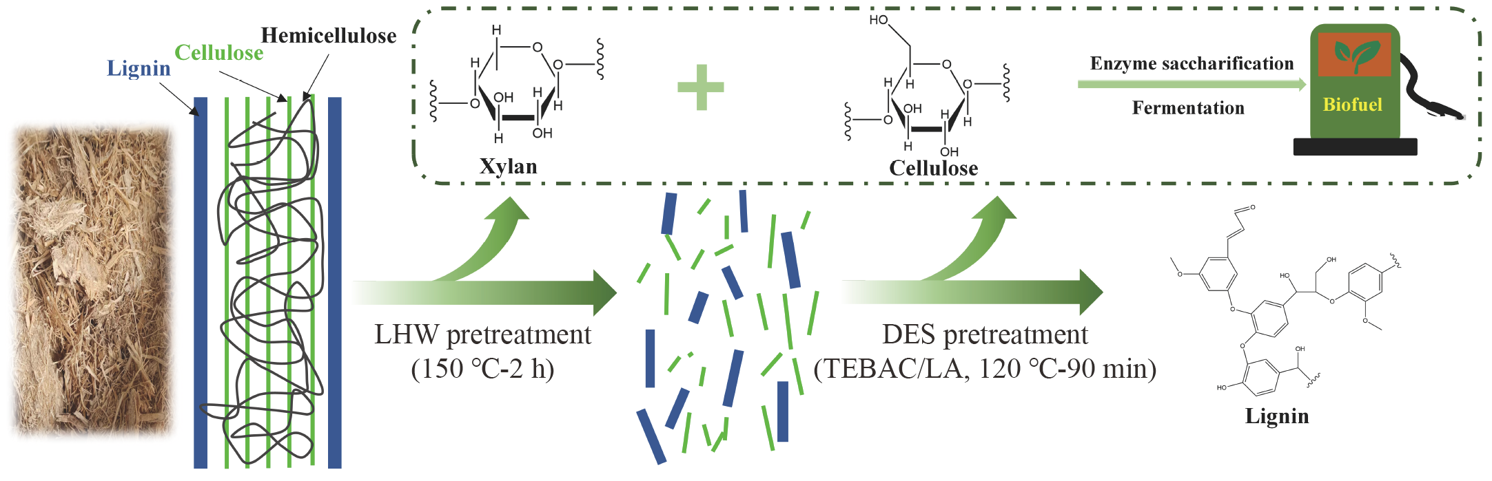 Download coverIn the present study, a sustainable pretreatment methodology combining liquid hot water and deep eutectic solvent is proposed for the efficient fractionation of hemicellulose, cellulose, and lignin from sugarcane bagasse, thereby facilitating the comprehensive utilization of both C5 and C6 sugars. The application of this combined pretreatment strategy to sugarcane bagasse led to notable enhancements in enzymatic saccharification and subsequent fermentation. Experiment results demonstrate that liquid hot water-deep eutectic solvent pretreatment yielded 85.05 ± 0.66 g·L–1 of total fermentable sugar (glucose: 60.96 ± 0.21 g·L–1, xylose: 24.09 ± 0.87 g·L–1) through enzymatic saccharification of sugarcane bagasse. Furthermore, fermentation of the pretreated sugarcane bagasse hydrolysate yielded 34.33 ± 3.15 g·L–1 of bioethanol. These findings confirm the effectiveness of liquid hot water-deep eutectic solvent pretreatment in separating lignocellulosic components, thus presenting a sustainable and promising pretreatment method for maximizing the valuable utilization of biomass resources.