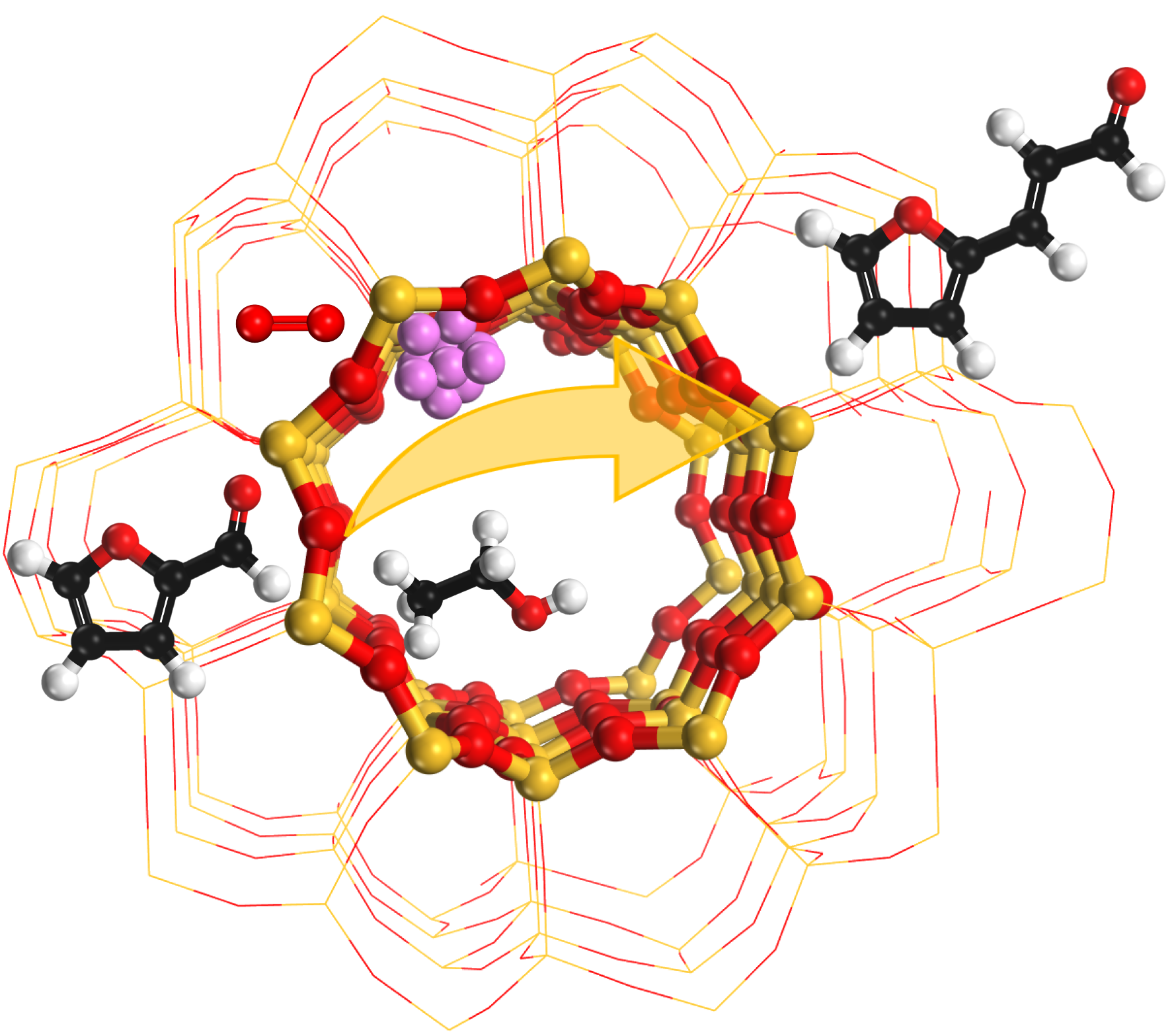 The oxidative condensation between renewable furfural and fatty alcohols is a crucial avenue for producing high-quality liquid fuels and valuable furan derivatives. The selectivity control in this reaction process remains a significant challenge. Herein, we report the strategy of confining well dispersed gold species within ZSM-5 structure to construct highly active Au@ZSM-5 zeolite catalysts for the oxidative condensation of furfural. Characterization results and spectroscopy analyses demonstrate the efficient encapsulation of isolated and cationic Au clusters in zeolite structure. Au@ZSM-5(K) catalyst shows remarkable performance with 69.7% furfural conversion and 90.2% furan-2-acrolein selectivity as well as good recycle stability. It is revealed that the microstructure of ZSM-5 zeolite can significantly promote oxidative condensation activity through confinement effects. This work presents an explicit example of constructing zeolite encaged noble metal catalysts toward targeted chemical transformations.