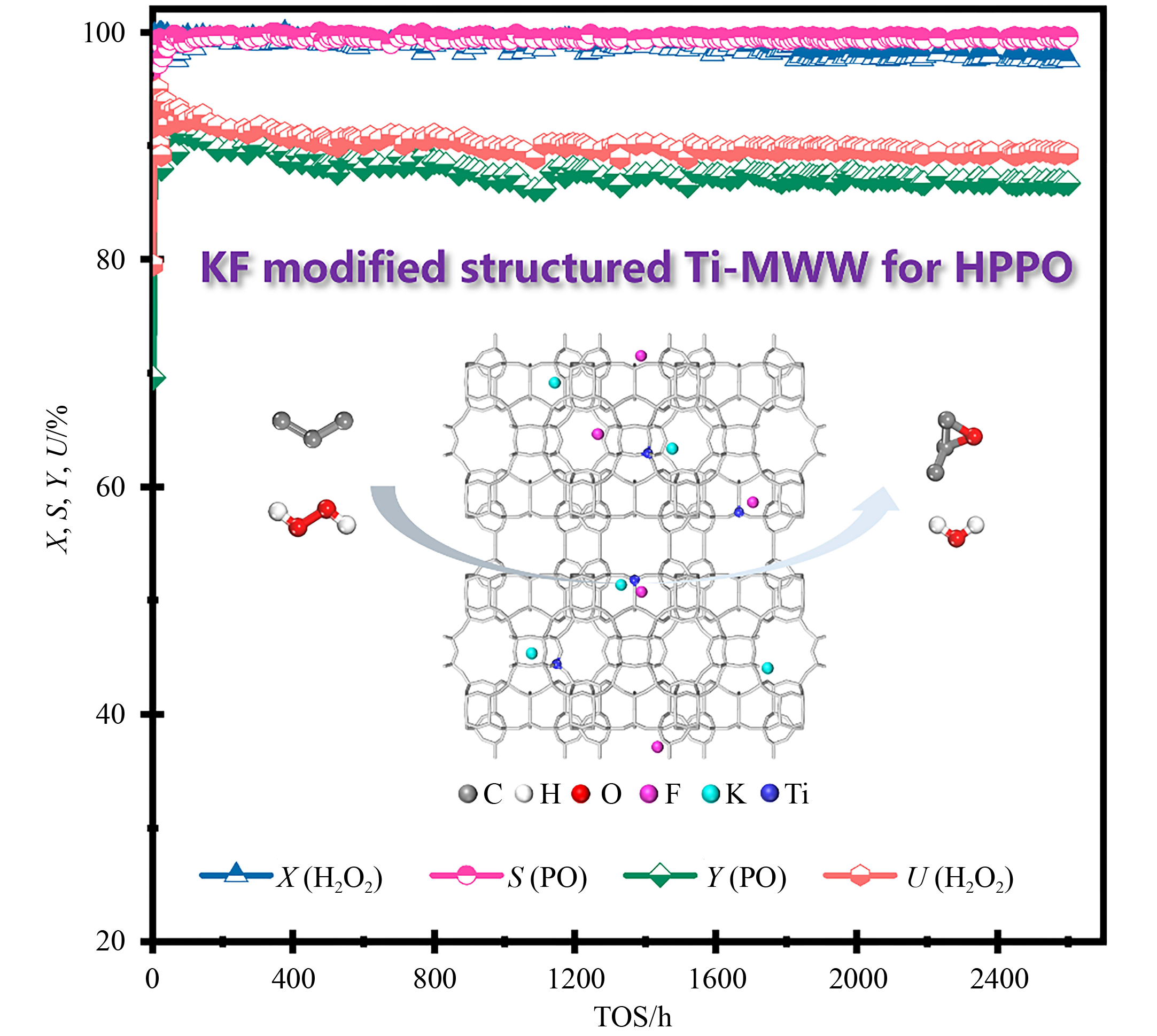 Epoxidation of propylene to propylene oxide (PO) with hydrogen peroxide (HPPO) is an environmentally friendly and cost-efficient process in which titanosilicates are used as catalysts. Ti-MWW is a potential industrial catalyst for this process, which involves the addition of HPPO to PO. The silanol groups generated during secondary crystallization unavoidably result in ring-opening of PO and inefficient decomposition of HPPO, which diminish the PO selectivity and the lifespan of Ti-MWW. To address this issue, we conducted post-treatment modifications of the structured Bf-Ti-MWW catalyst with potassium fluoride aqueous solutions. By quenching the silanol groups with potassium fluoride and implanting electron-withdrawing fluoride groups into the Ti-MWW framework, both the catalytic activity and HPPO utilization efficiency were increased. Moreover, the ring opening reaction of PO was prohibited. In a continuous fixed-bed liquid-phase propylene epoxidation reaction, the KF-treated structured Ti-MWW catalyst displayed an exceptionally long lifespan of 2700 h, with a PO yield of 590 g·kg−1·h−1.