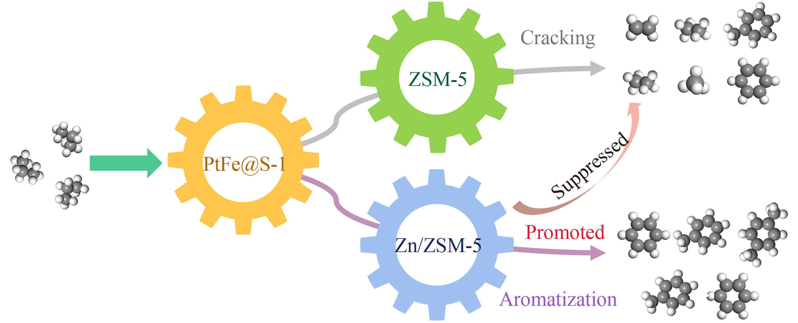 Unraveling the structure-activity relationship and improving the catalytic performance is paramount in propane dehydro-aromatization reactions. Herein, a tandem catalyst with high propane dehydro-aromatization reaction performance was prepared via coupling the PtFe@S-1 with Zn/ZSM-5 zeolites (PtFe@S-1&1.0Zn/ZSM-5), which exhibits high dehydrogenation activity, aromatics selectivity (~60% at ~78% propane conversion), and stability. The addition of zinc inhibits the cleavage of C6= intermediates on ZSM-5 and promotes the aromatization pathway by weakening zeolite acid strength, significantly improving the selectivity to aromatics. This understanding of the structure-activity relationship in propane dehydro-aromatization reaction helps develop future high-performance catalysts.