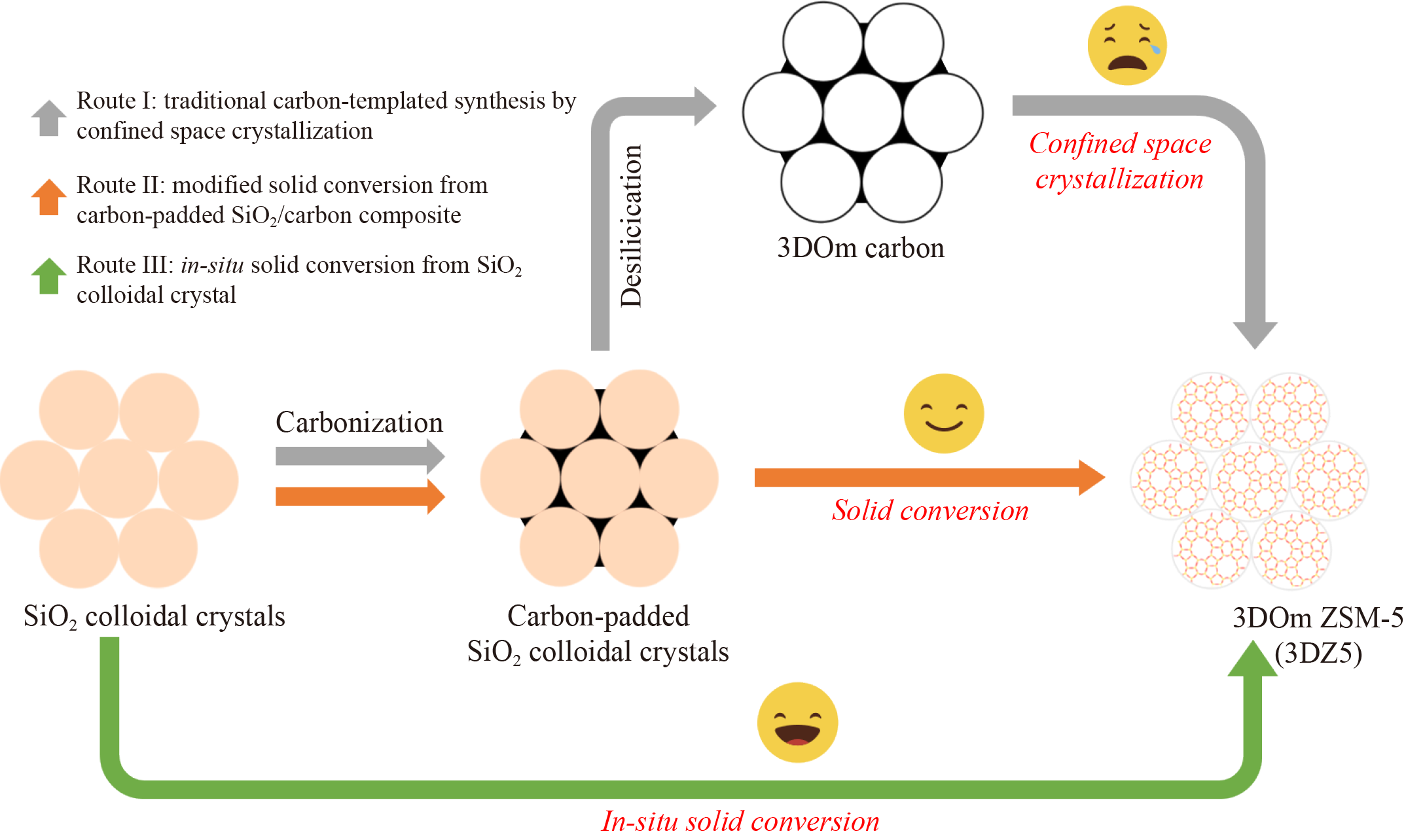 A facile synthesis of hierarchical ZSM-5 with the three-dimensionally ordered mesoporosity (3DOm ZSM-5) was achieved by solid conversion (SC) of SiO2 colloidal crystals to high-crystalline ZSM-5. The products of 3DZ5_S/C and 3DZ5_S, which were severally transformed from the carbon-padded SiO2 colloidal crystals and the initial SiO2 colloidal crystals, exhibited not only a similar ordered structure and acidity but also higher crystallinity and more balanced meso-/micropore combination in comparison with 3DZ5_C obtained by the conventional confined space crystallization approach. All three synthesized 3DZ5 catalysts showed improved methanol-to-propylene performance than the commercially microporous ZSM-5 (CZ5), embodied in five times longer lifetime, higher propylene selectivity and Spropylene/Sethylene ratio (P/E), and superior coke toleration with lower formation rate of coke (Rcoke). Moreover, the 3DZ5_S catalyst in situ converted from SiO2 colloidal crystals presented the highest selectivities of propylene (42.51%) and light olefins (74.6%) among all three 3DZ5 catalysts. The high efficiency in synthesis and in situ utilization of SiO2 colloidal crystals demonstrate the proposed SC strategy to be more efficiently and eco-friendly for the high-yield production of not only 3DOm ZSM-5 but also other types of hierarchical zeolites.