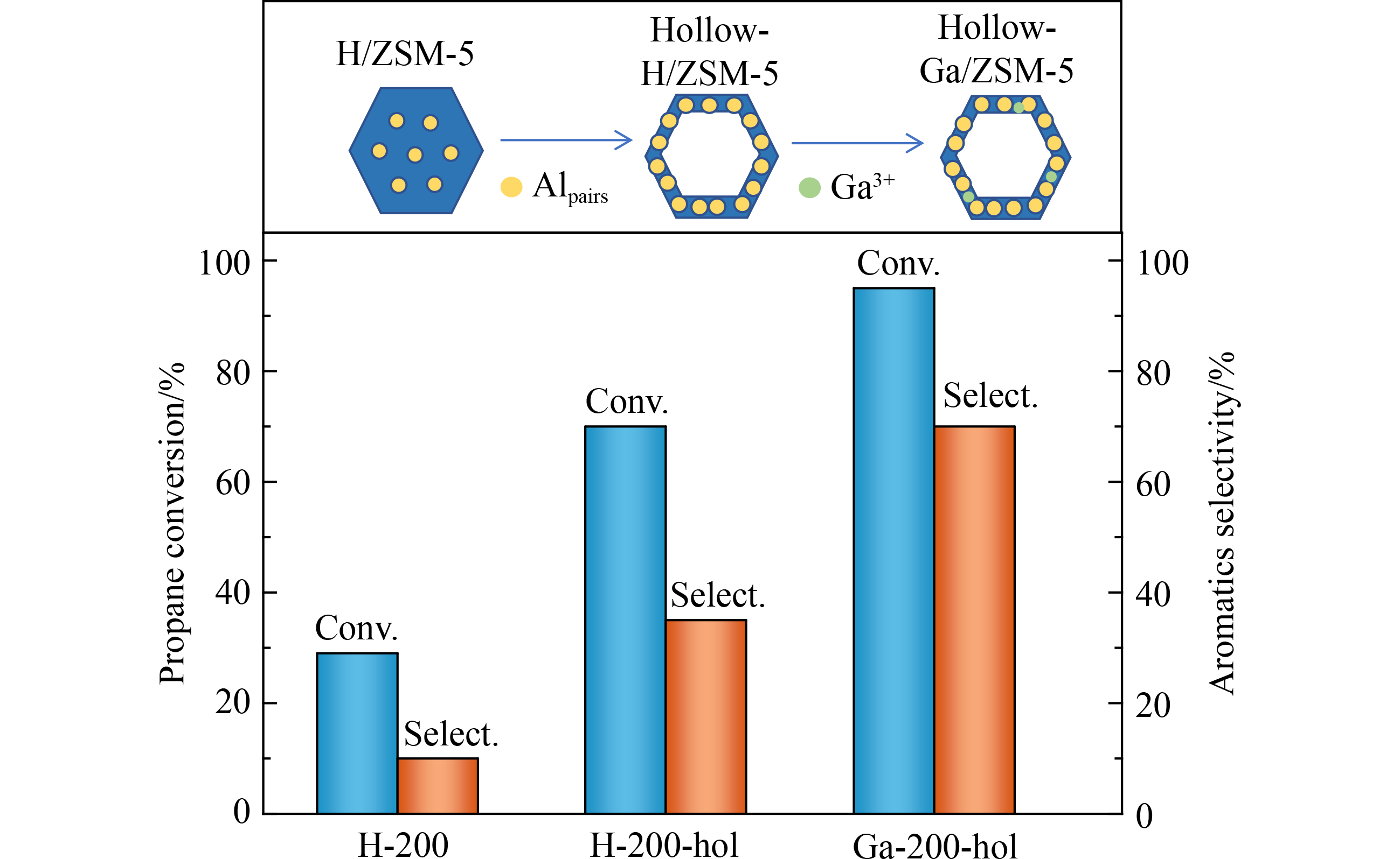 Regulation of aluminum distribution in zeolite framework is an effective method for improving its catalytic performance for propane aromatization. Herein, we found that recrystallization and post-realuminization of ZSM-5 cannot only create hollow structures to enhance the diffusion ability, but also adjust the content and position of paired aluminum species in its framework. Various characterizations results confirmed that increase of paired aluminum content and inducement of more aluminum atoms sited in the intersection cavity are beneficial to the formation of aromatic products in propane aromatization. As a result, the hollow-structured ZSM-5 zeolite with more paired aluminum (H-200-hollow) showed higher propane conversion and aromatics selectivity than other samples at the same conditions. The catalytic performance of H-200-hollow can be further improved by ion-exchanging with a small amount of Ga(III) species. The propane conversion and aromatics selectivity of Ga-200-hollow reached as high as 95% and 70%, respectively, at 540 °C and 1 atm.
