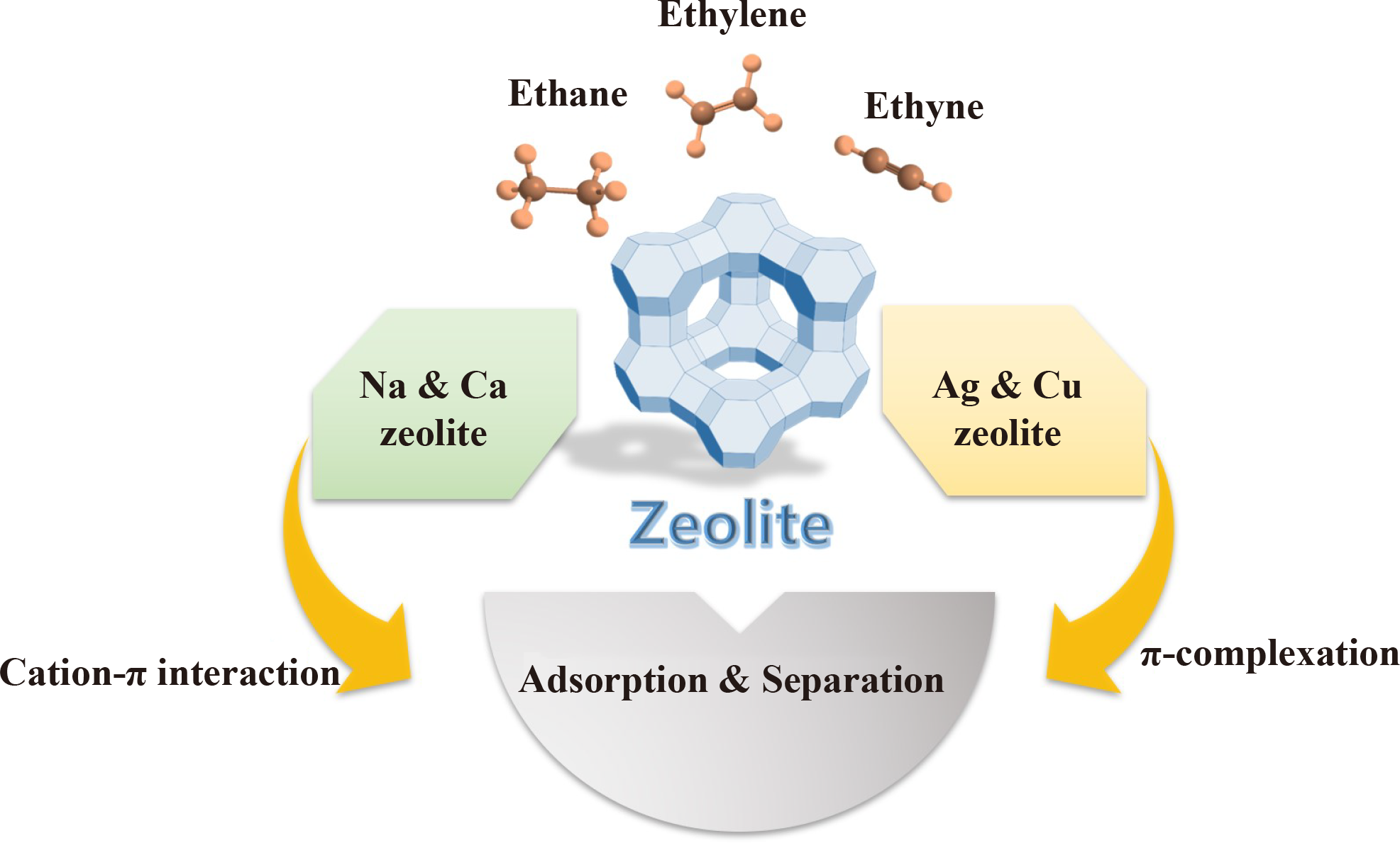 The cost-effective separation of ethylene (C2H4), ethyne (C2H2), and ethane (C2H6) poses a significant challenge in the contemporary chemical industry. In contrast to the energy-intensive high-pressure cryogenic distillation process, zeolite-based adsorptive separation offers a low-energy alternative. This review provides a concise overview of recent advancements in the adsorptive separation of C2H4, C2H2, and C2H6 using zeolites or zeolite-based adsorbents. It commences with an examination of the industrial significance of these compounds and the associated separation challenges. Subsequently, it systematically examines the utilization of various types of zeolites with diverse cationic species in such separation processes. And then it explores how different zeolitic structures impact adsorption and separation capabilities, considering principles such as cation-π interaction, π-complexation, and steric separation concerning C2H4, C2H2, and C2H6 molecules. Furthermore, it discusses methods to enhance the separation performance of zeolites and zeolite-based adsorbents, encompassing structural design, modifications, and ion exchange processes. Finally, it summarizes current research trends and future directions, highlighting the potential application value of zeolitic materials in the field of C2H4, C2H2, and C2H6 separation and offering recommendations for further investigation.
