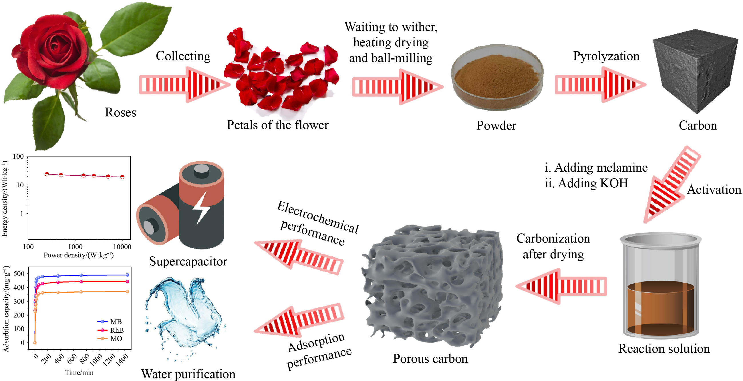 Download coverWith the advancement of social process, the resource problem is becoming more prominent, biomass materials come into being, and it is becoming more and more important to explore and prepare efficient and multifunctional biomass materials to alleviate the problems of energy storage and water pollution. In this paper, nitrogen-doped hierarchical porous carbon materials (NRRC) were produced by one-step carbonization of withered rose as raw material and melamine as nitrogen source with KOH-activated porosification. The resulting nitrogen-doped porous carbon material had the most abundant pores and the best microspherical graded pore structure, with a specific surface area of up to 1393 m2·g–1, a pore volume of 0.68 cm3·g–1, and a nitrogen-doped content of 5.52%. Electrochemical tests showed that the maximum specific capacitance of NRRC in the three-electrode system was 346.4 F·g–1 (0.5 A·g–1), which was combined with favorable capacitance retention performance and cycling stability. The NRRC//NRRC symmetric supercapacitors were further assembled, and the maximum energy density of a single device was 23.88 Wh·kg–1, which still maintains excellent capacitance retention and cyclic charging/discharging stability. For example, the capacitance retention rate was always close to 96.27% with almost negligible capacitance loss after 10000 consecutive charge/discharge cycles (current density: 10 A·g–1). Regardless of the three-electrode or two-electrode system, the super capacitive performance of NRRC porous carbon materials was comparable to the electrochemical performance of many reported biomass porous carbon materials, which showed better energy storage advantages and practical application potential. In addition, NRRC porous carbon materials had excellent water purification ability. The dye adsorption test confirmed that NRRC had a high adsorption capacity (491.47 mg·g–1) for methylene blue. This undoubtedly also showed a potential and promising avenue for high value-added utilization of this material.