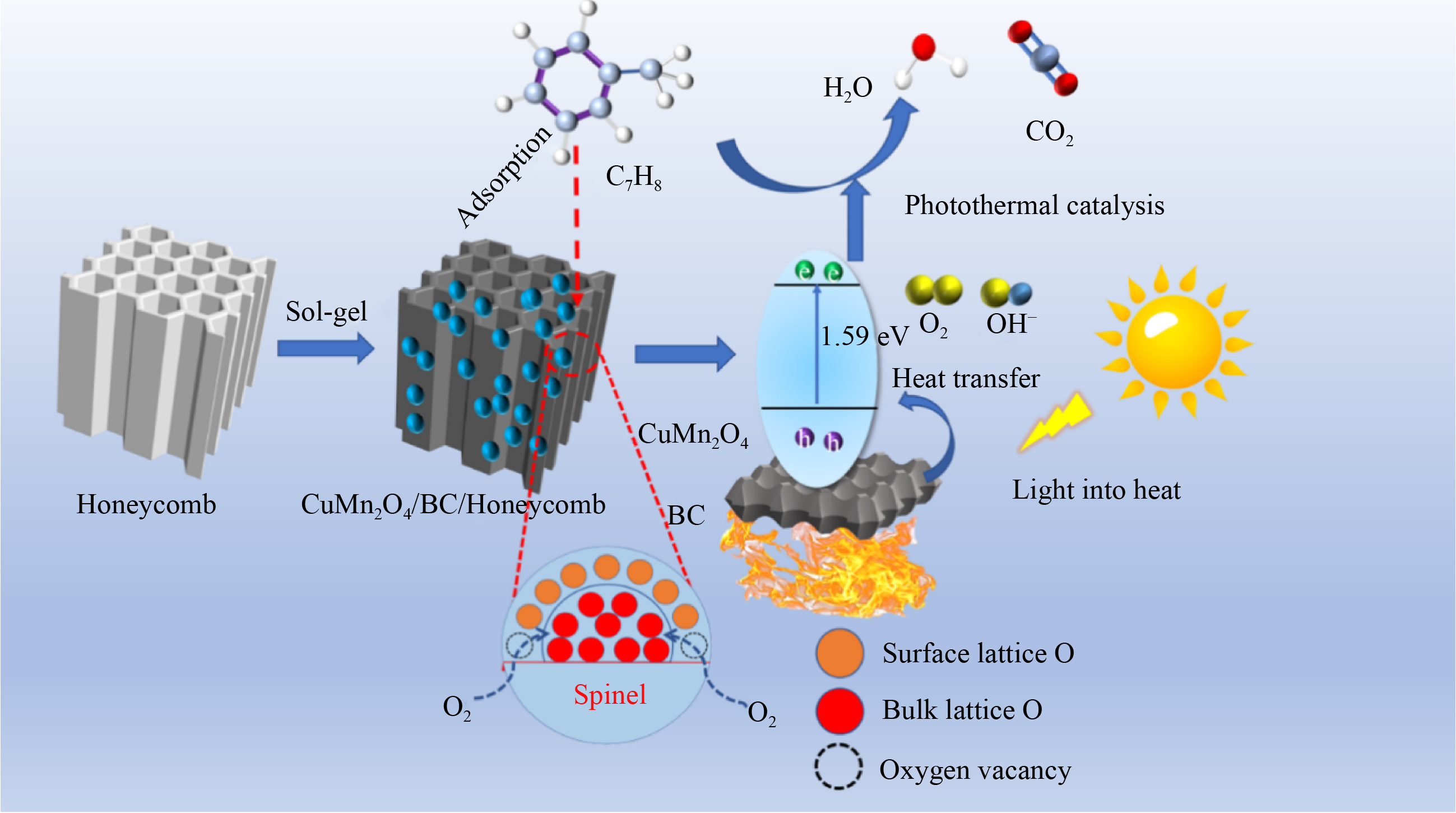 Photothermal catalytic oxidation emerges as a promising method for the removal of volatile organic compounds (VOCs). Herein, via sol-gel impregnation method, spinel CuMn2O4 was coated on attapulgite honeycombs with integrating biochar (BC) film as the second carrier, using chestnut shell as complexation agent. Various mass ratios of CuMn2O4 to chestnut shell was modulated to investigate the catalytic toluene degradation performance. Results indicated that the monolithic CuMn2O4/BC/honeycomb catalyst demonstrated superior photothermal catalytic toluene degradation with a low T90 (temperature at 90% degradation) of 263 °C when the mass ratio of CuMn2O4 to biomass was 1:4. The addition of BC film substantially increased the honeycomb's specific surface area and improved the photothermal conversion of spinel, leading to enhanced photothermal catalytic activity. This study presents a cost-effective strategy for eliminating industrial VOCs using clay-biomass based monolithic catalyst.