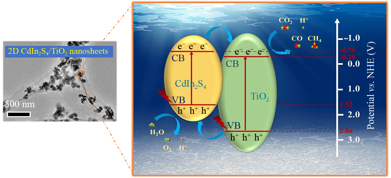 Photocatalytic CO2 reduction is a promising solution to simultaneously provide renewable chemical fuels and address the greenhouse effect. However, designing practical photocatalysts with advanced architectures remains challenging. Herein, we report the preparation of a novel CdIn2S4/TiO2 binary heterojunction via an in situ solvothermal approach, which exhibits superior photocatalytic activity for sunlight-driven CO2 reduction. The CdIn2S4/TiO2 composites exhibit significantly enhanced photocatalytic performance for CO2 reduction compared to unmodified TiO2. Among them, the 3% CdIn2S4/TiO2 composite has optimal CO and CH4 evolution rates of 18.32 and 1.03 μmol·g–1·h–1, respectively. The yield of CO is 4.7 times higher than that of pristine TiO2. This improved photocatalytic activity of the CdIn2S4/TiO2 heterostructure can be attributed to its large surface area, extended light absorption range and high separation efficiency of photogenerated electron-hole pairs, which are supported by the results of photoluminescence spectroscopy and the photoelectrochemical measurements. Moreover, the photocatalytic mechanism based on the binary CdIn2S4/TiO2 heterojunction is proposed and separation process of photogenerated electron-hole pairs is discussed. In brief, we aim to provide insights into the application of TiO2 in energy conversion processes through the construction of heterogeneous junctions.