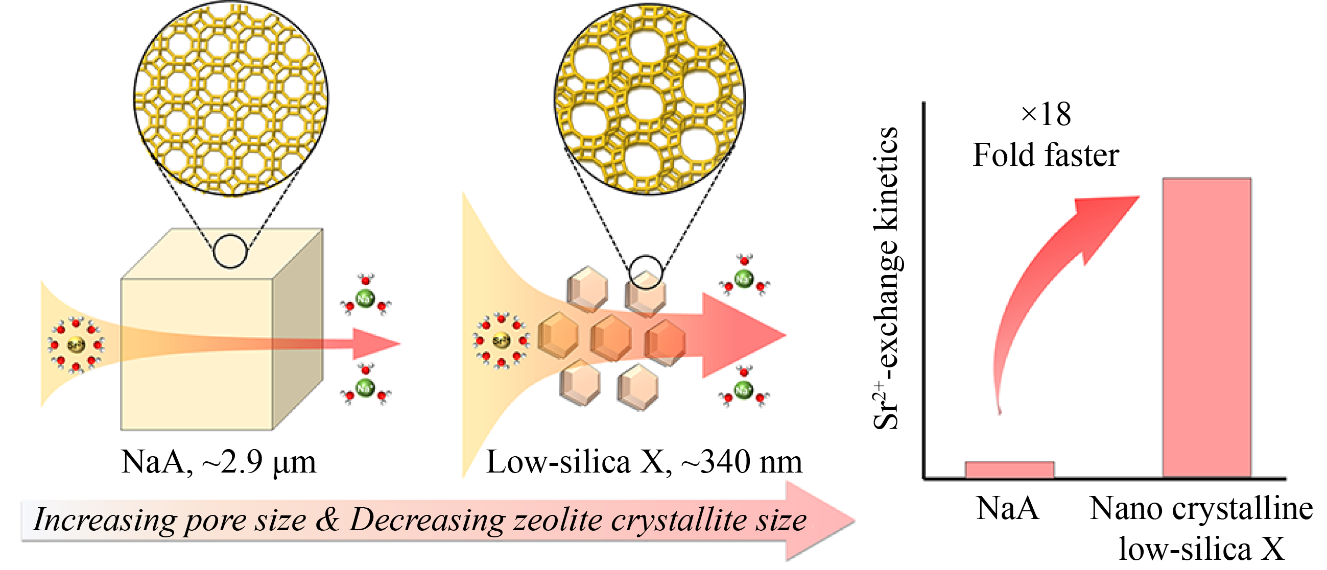 NaA zeolite (Si/Al = 1.00) has been commercially applied for capturing radioactive 90Sr2+ because of its high surface charge density, effectively stabilizing the multivalent cation. However, owing to its narrow micropore opening (4.0 Å), large micron-sized crystallites, and bulkiness of hydrated Sr2+, the Sr2+ exchange over NaA has been limited by very slow kinetics. In this study, we synthesized nanocrystalline low-silica X by minimizing a water content in a synthesis gel and utilizing a methyl cellulose hydrogel as a crystal growth inhibitor. The resulting zeolite exhibited high crystallinity and Al-rich framework (Si/Al of approximately 1.00) with the sole presence of tetrahedral Al sites, which are capable of high Sr2+ uptake and ion selectivity. Meanwhile, the zeolite with a FAU topology has a much larger micropore opening size (7.4 Å) and a much smaller crystallite size (~340 nm) than NaA, which enable significantly enhanced ion-exchange kinetics. Compared to conventional NaA, the nanocrystalline low-silica X exhibited remarkably increased Sr2+-exchange kinetics (> 18-fold larger rate constant) in batch experiments. Although both the nanocrystalline low-silica X and NaA exhibited comparable Sr2+ capacities under equilibrated conditions, the former demonstrated a 5.5-fold larger breakthrough volume than NaA under dynamic conditions, attributed to its significantly faster Sr2+-exchange kinetics.