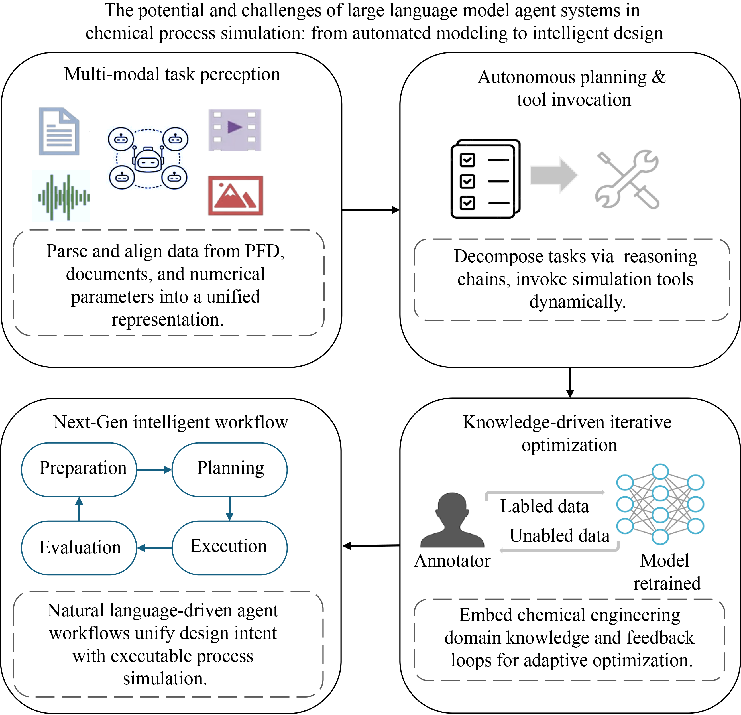 Large language model-based agent systems are emerging as transformative technologies in chemical process simulation, enhancing efficiency, accuracy, and decision-making. By automating data analysis across structured and unstructured sources—including process parameters, experimental results, simulation data, and textual specifications—these systems address longstanding challenges such as manual parameter tuning, subjective expert reliance, and the gap between theoretical models and industrial application. This paper reviews the key barriers to broader adoption of large language model-based agent systems, including unstable software interfaces, limited dynamic modeling accuracy, and difficulties in multimodal data integration, which hinder scalable deployment. We then survey recent progress in domain-specific foundation models, model interpretability techniques, and industrial-grade validation platforms. Building on these insights, we propose a technical framework centered on three pillars: multimodal task perception, autonomous planning, and knowledge-driven iterative optimization. This framework supports adaptive reasoning and robust execution in complex simulation environments. Finally, we outline a next-generation intelligent paradigm where natural language-driven agent workflows unify high-level strategic intent with automated task execution. The paper concludes by identifying future research directions to enhance robustness, adaptability, and safety, paving the way for practical integration of large language model based agent systems into industrial-scale chemical process simulation.