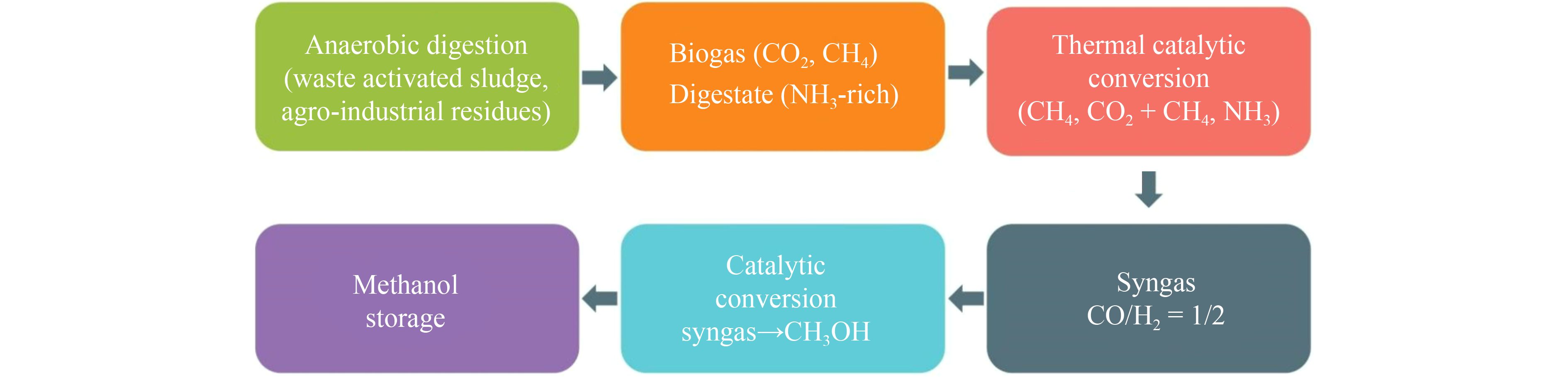 An anaerobic digester of sewage sludge or agro-industrial waste produces biogas and ammonia-rich digestate. Three H2-producing processes exist: dry reforming of methane (from biogas), catalytic decomposition of methane (from biogas after CO2 capture), and catalytic decomposition of ammonia (from digestate). Dry reforming of methane offers the best syngas yield at 700 °C and for a 50–50 vol % CH4/CO2 biogas. Catalytic decomposition of methane achieved a H2 yield of 95%. Finally, the digestate was stripped and NH3 was further completely decomposed into H2 and N2, for a complete NH3 conversion at 650 °C. A methanol valorization case study of a wastewater treatment plant of 300000 person equivalents with an anaerobic digester is examined. The methanol production from syngas (H2/CO) and H2 product streams is simulated using Aspen Plus®. This anaerobic digester process will daily generate 4485 m3 CH4, 2415 m3 CO, and 320 kg NH3. The methanol production will be 183 kg·h–1 (1600 t·y–1). The additional H2 from ammonia’s catalytic decomposition (631 m3·d–1) can be valorized with excess biogas in the anaerobic digester-associated combined heat and power unit. Due to a significantly higher ammonia concentration in manure, catalytic decomposition of ammonia will produce more H2 if manure would be co-digested.