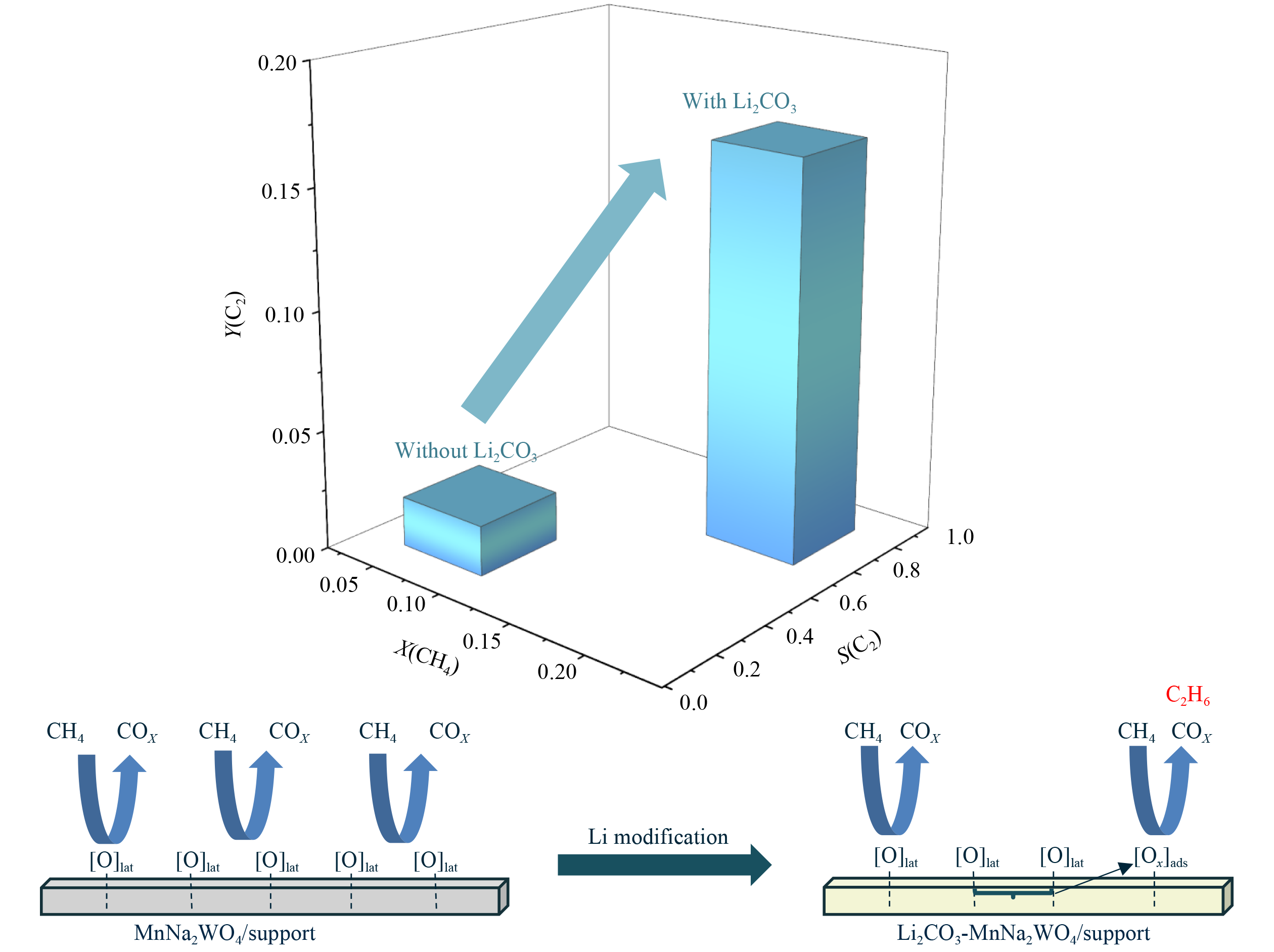 The main challenge in the oxidative coupling of methane to C2H6/C2H4 (C2-hydrocarbons) lies in the low selectivity to the desired products due to their high reactivity to form carbon oxides. Herein, we report that the selectivity in chemical looping oxidative coupling of methane over supported Mn-Na2WO4-based catalysts can be significantly increased by catalyst promotion with Li2CO3 and performing the reaction with co-fed steam. The selectivity reaches 89% (about 60% C2H4 selectivity) at a methane conversion of 19%. The best-performing catalyst showed durable within 90 reaction/reoxidation cycles. With the aid of sophisticated catalyst characterization studies combined with temporal analysis of products, the origins of the enhancing effects of the promoter and steam have been elucidated and can be applied for the development of selective catalysts in various alkane oxidation reactions.