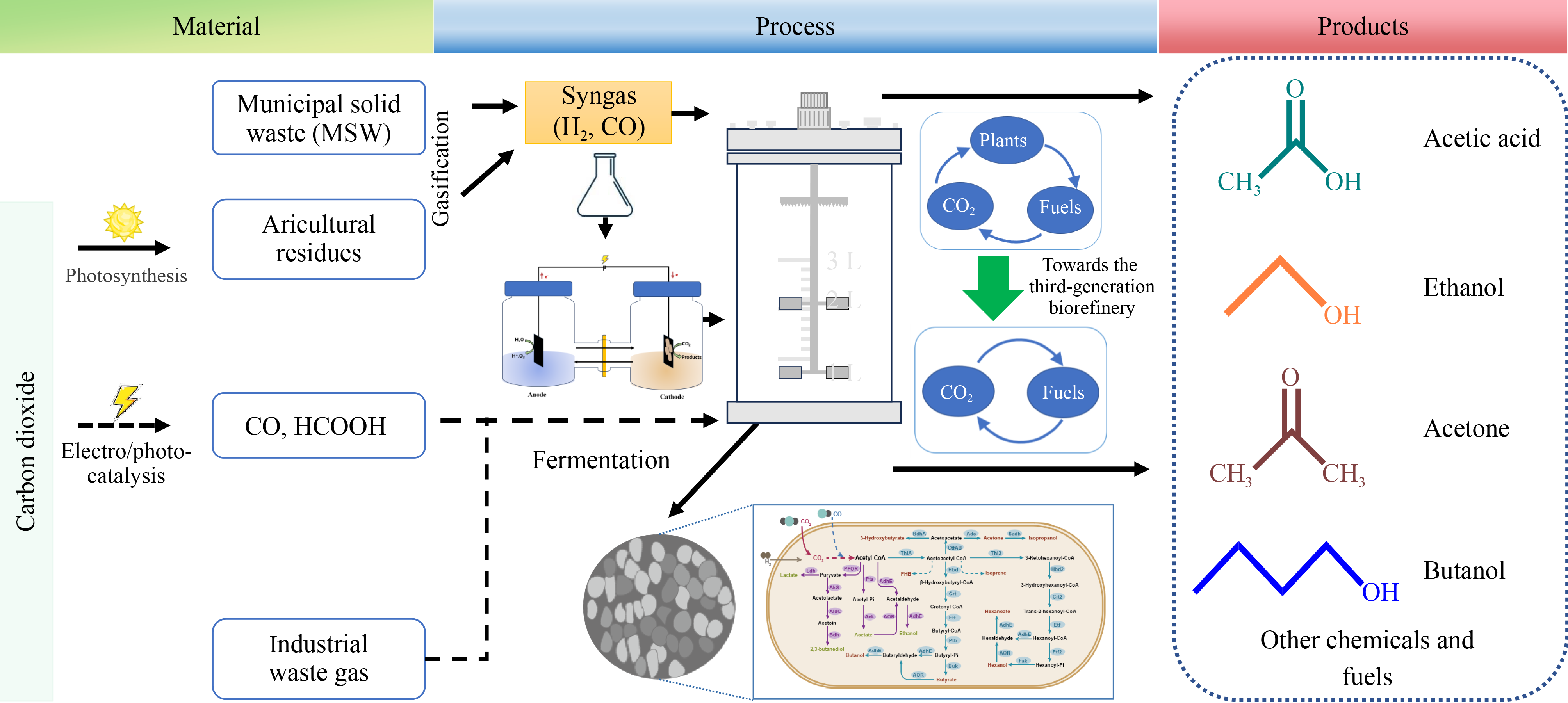 The growing emphasis on low-carbon lifestyles and the reduction of carbon emissions has spurred interest in renewable energy-driven biomanufacturing. The third-generation biomanufacturing concept leverages microbial cell factories to convert renewable energy sources, including solar and electrical energy, and inorganic materials, into high-value fuels and chemicals. Microbial CO2 fixation, with its mild reaction conditions and ability to generate diverse products, is a compelling alternative to traditional chemical catalysis, which is generally characterized by high energy demands, pollution, and limited product diversity. Clostridium stands out among microorganisms for its natural ability to fix carbon via the Wood-Ljungdahl pathway, which enables CO2, CO, and H2 to be used for growth and product synthesis. Advances in genetic engineering tools for Clostridium have led to the biosynthesis of over 40 natural compounds, expanding its industrial potential. Furthermore, integrating Clostridium into photoelectrochemical systems has demonstrated the feasibility of coupling microbial fermentation with renewable energy inputs. This review comprehensively examines the Wood-Ljungdahl pathway, related metabolic pathways, and key enzymes, along with the latest progress in genetic modification tools. The potential of Clostridium as a biocatalyst for one-carbon gas conversion and its integration with clean energy technologies is highlighted, offering valuable perspectives for future research.