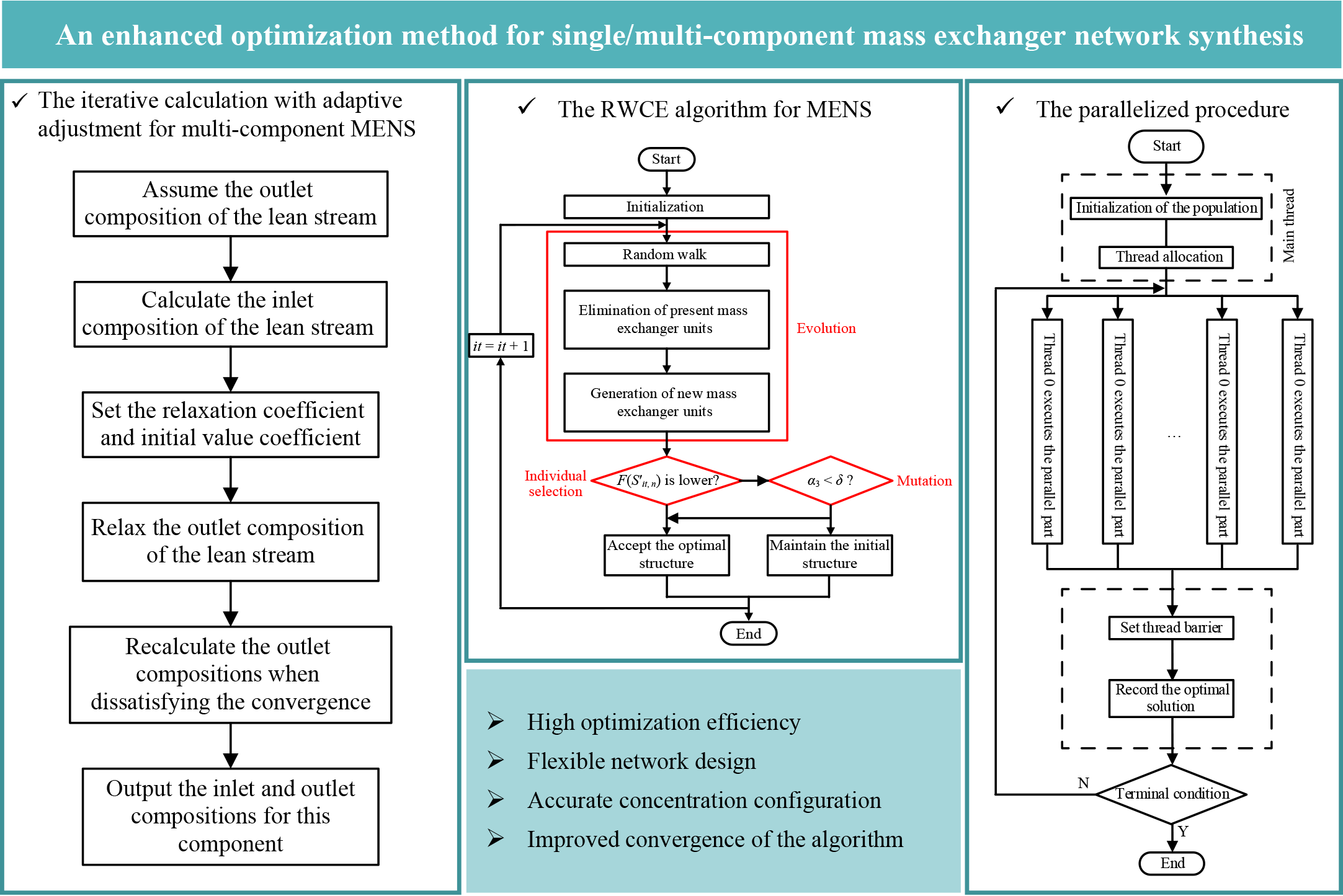 This paper proposes an innovative simultaneous optimization approach for single and multi-component mass exchanger network synthesis (MENS). A retrofitted stage-wise superstructure and a parallelized random walk algorithm with compulsive evolution (RWCE) are adopted. An iterative calculation method is designed to satisfy the requirements of multi-component mass transfer, with a relaxation for the outlet composition of the lean streams. The parametric analysis shows that the relaxation coefficient plays a major role in driving the convergence of the method. To improve the robustness of the established model, an adaptive relaxation coefficient strategy is implemented for multi-component MENS problems. In a divergence situation, the outlet concentration of the lean stream can be adjusted automatically by a random relaxation coefficient. Finally, three industrial MENS examples are considered in this work, whose total annual cost (TAC) are reduced by 7179, 2212, and 551 $·year–1. The corresponding optimization times are obtained to be 336, 125, and 145 s. The results indicate improvements in the economy and time, demonstrating that the parallelized RWCE can yield an optimal TAC and optimization efficiency compared to previous results. Overall, the adaptive relaxation coefficient strategy enhances the convergence for multi-component MENS problems.