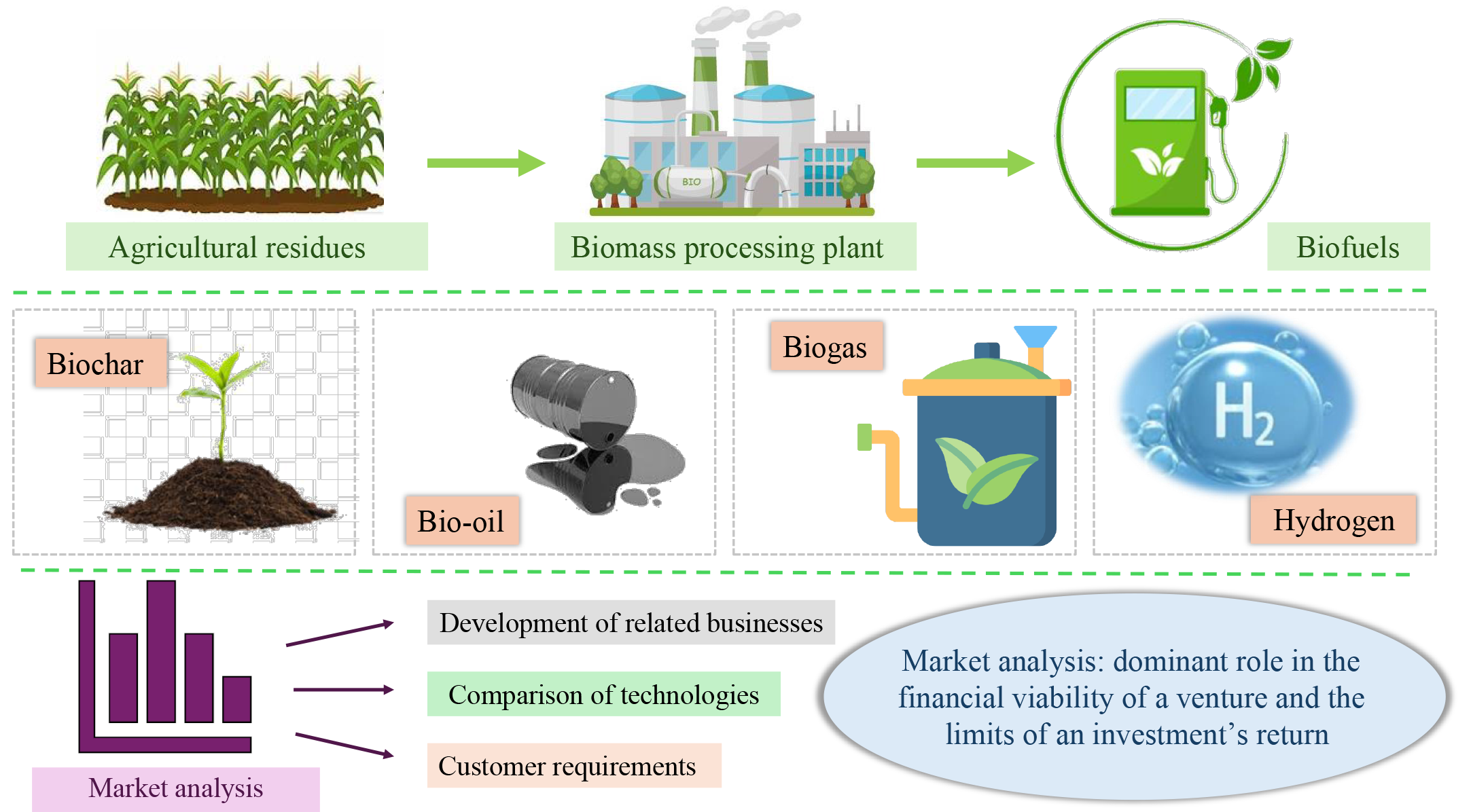 Rapid population growth, economic development, resource constraints and various geopolitical problems, as well as intensifying environmental issues are leading to a worsening energy crisis. Oil, natural gas and coal are still the main sources of primary energy. Biofuels, such as biochar, bio-oil, biogas, and hydrogen, are one of the most significant renewable and sustainable energy sources. Their use can reduce net greenhouse gas emissions as well as dependence on imported fossil fuels, in response to the above, while the production and exploitation of biomass mainly from agricultural residues can also create jobs in rural and depopulated areas. In this study, a market analysis for biochar, bio-oil, biogas, and hydrogen was conducted worldwide intending to provide detailed information for the economic viability of sustainable agricultural systems and to specify the prospects for an economically viable introduction of each of the bio-products into the energy market. The results revealed that indeed these biofuels are one of the most significant and energy sources offering sustainability by reducing gas emissions into the atmosphere but also by managing residual biomass, thus contributing to waste management. A rapid acceleration is expected in the next years followed by price reduction.
