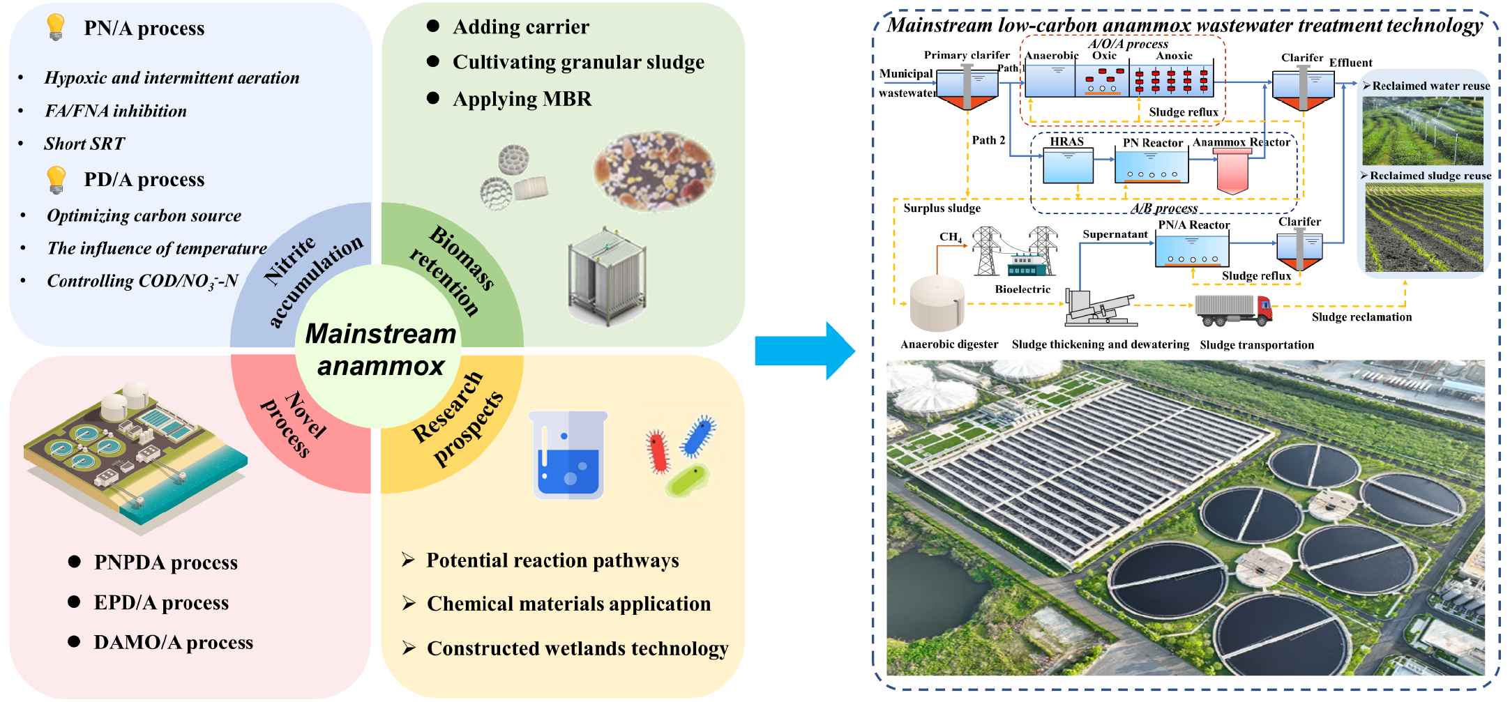 Download coverEnhancing nitrogen removal is a very active branch in municipal wastewater treatment research, toward this end, anammox technology is a sustainable solution. This review systematically outlines the strategies employed to enhance mainstream anammox performance, including nitrite accumulation and microbial enrichment based on partial nitrification coupled anammox and partial denitrification coupled anammox, developed to address the challenges of low ammonium content in wastewater, nitrate accumulation in the effluent, and the influence of organic matter. The characteristics and advantages of novel anammox-coupled processes, including partial nitrification and partial denitrification coupled anammox, endogenous partial denitrification coupled anammox, and denitrifying anaerobic methane oxic coupled anammox are also comprehensively discussed; these aim to ensure the highly efficient and stable operation of anammox under diverse wastewater conditions by constructing a composite biological nitrogen removal system based on anammox, supplemented by nitrification-denitrification and other processes. Additionally, a novel anammox application route including mainstream partial denitrification/anammox and absorption-biodegradation as well as sidestream partial nitrification/anammox is proposed, and its application pathway in conceptual wastewater treatment plants is outlined, aiming to foster the development of cost-effective, efficient, and energy-saving advanced wastewater treatment processes. Finally, prospects are presented that indicate the gaps in contemporary research and potential future research directions. Overall, this review provides a reference for treating municipal wastewater with anammox and sheds new light on related strategies and nitrogen removal mechanisms.
