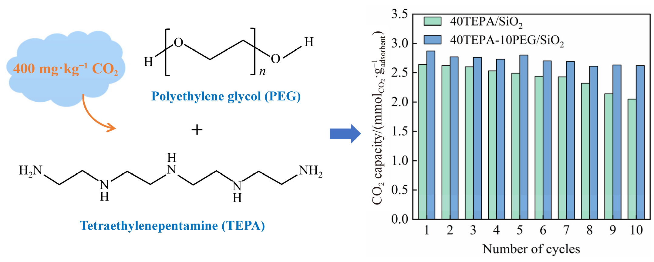Direct air capture (DAC) using amine-functionalized solid adsorbents holds promise for achieving negative carbon emissions. In this study, a series of additive-incorporated tetraethylenepentamine-functionalized SiO2 adsorbents with varying tetraethylenepentamine and additive contents were prepared via a simple impregnation method, characterized by various techniques, and applied in the DAC process. The structure-performance relationship of these adsorbents in DAC was investigated, revealing that the quantity of active amine sites (or the tetraethylenepentamine content in the exposed layer), as determined by CO2-TPD measurement, was an important factor affecting the adsorbent performance. This factor, which varied with the tetraethylenepentamine content, additive type, and additive content, showed a positive correlation with the CO2 adsorption capacity of the adsorbents. The optimal adsorbent, 40TEPA-10PEG/SiO2 containing 40 wt % tetraethylenepentamine and 10 wt % polyethylene glycol (Mn = 200), exhibited a stable CO2 capacity of 2.1 mmol·g–1 and amine efficiency of 0.22 over 20 adsorption–desorption cycles (adsorption at 400 ppm CO2/N2 and 30 °C for 60 min, and desorption at pure N2 and 90 °C for 20 min). Moreover, even after deliberate accelerated oxidation treatment (pretreated in air at 100 °C for 10 h), the CO2 capacity of 40TEPA-10PEG/SiO2 remained at 2.0 mmol·g–1. The superior thermal and oxidative stability of 40TEPA-10PEG/SiO2 makes it a promising adsorbent for DAC applications.