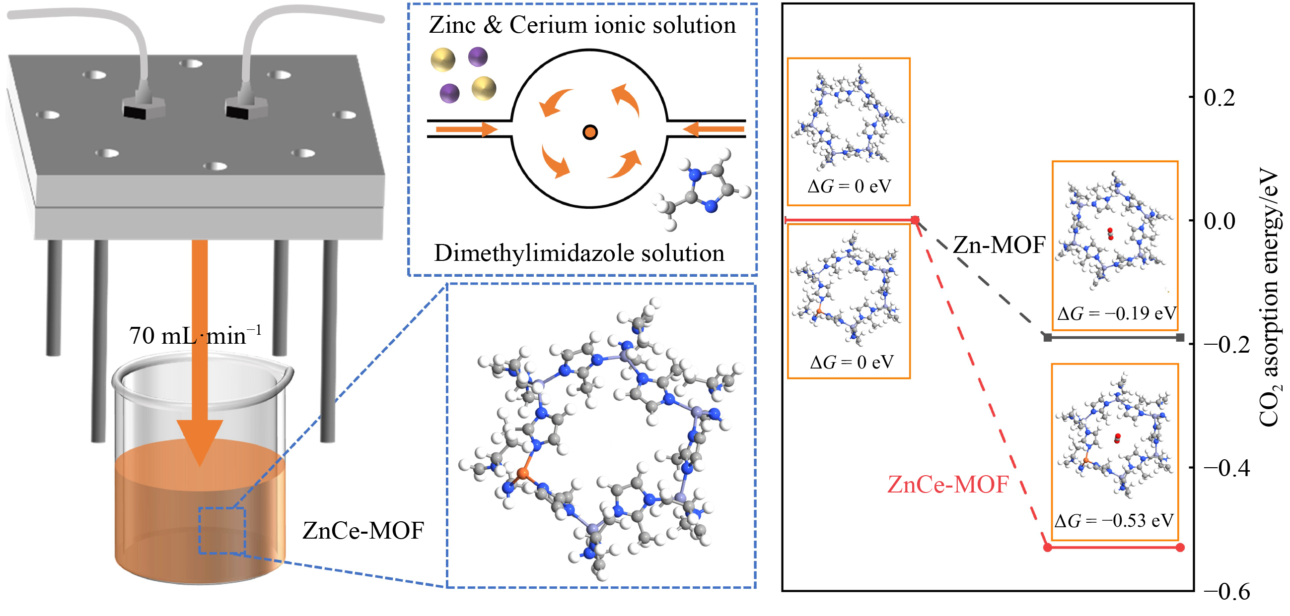 The use of metal-organic frameworks (MOFs) as CO2-gas-capture materials has attracted extensive research attention. In this study, two types of MOFs—Zn-MOF and ZnCe-MOF—were synthesized utilizing the microchannel reaction method, with water being employed as the solvent. The specific surface area, pore size, and pore volume of Zn-MOF and ZnCe-MOF were 1566.4 and 15.6 m2·g–1, 0.65 and 7.32 nm, as well as 1.65 and 0.03 cm3·g–1, respectively. Furthermore, Ce doping not only increased the pore size of ZnCe-MOF but also its adsorption energy from −0.19 eV (Zn-MOF) to −0.53 eV (ZnCe-MOF). At 298 K, the adsorption capacities of Zn-MOF and ZnCe-MOF were 0.66 and 0.74 mmol·g–1, respectively. In addition, the CO2 adsorption behaviors of Zn-MOF and ZnCe-MOF were linear and logarithmic, respectively. Theoretical calculations show that the results of adsorption thermodynamic simulations were consistent with the experiments. Thus, the preparation of ZnCe-MOF materials using a microchannel reactor provides a new approach for the continuous preparation of MOFs.