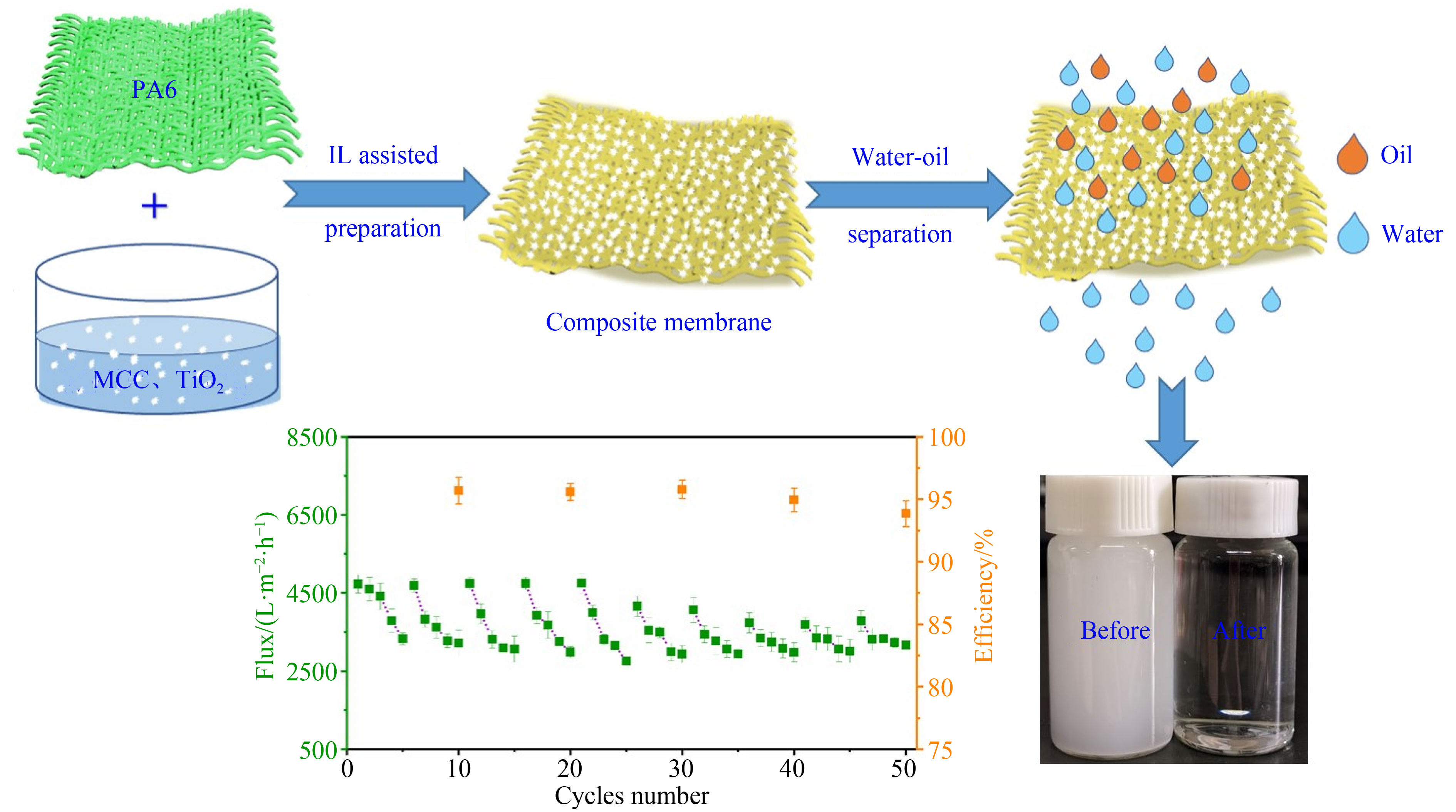 Using the chemically stable and cost-effective nylon PA6 as a substrate with the help of the high hydrophilicity of microcrystalline cellulose (MCC) and TiO2 nanoparticles to build micro-nanostructures on the surface of the nylon PA6, the superhydrophilic and underwater oleophobic composite membrane was fabricated to achieve the high efficiency of water–oil separation. TiO2 nanoparticles wrapped in MCC were evenly dispersed on the composite membrane, and the pore size of the composite membrane decreased with increasing MCC mass fraction. MCC can be tightly bound to the surface of the PA6 membrane because of its excellent film-forming properties and ability to cross-link with PA6. The modification of TiO2 and MCC led to a reduction in the surface adhesion of the composite membrane to oil droplets. The separation efficiency of the composite membrane for water–oil emulsions followed the order TiO2@2MCC-PA6 > TiO2@MCC-PA6 > TiO2-PA6 > PA6, and the change in filtration flux was exactly the opposite. TiO2@MCC-PA6 was the best composite membrane for three water–oil emulsions with sodium dodecyl sulfate (SDS), and its separation efficiency was over 96%. The water contact angle and underwater oil contact angle of TiO2@MCC-PA6 changed slightly after it was immersed in acidic and alkaline solutions for 36 h. The filtration flux and separation efficiency of TiO2@MCC-PA6 for n-hexane/SDS/water were still above 3100 L·m −2·h−1·bar−1 and 93%, respectively, after 50 cycles.