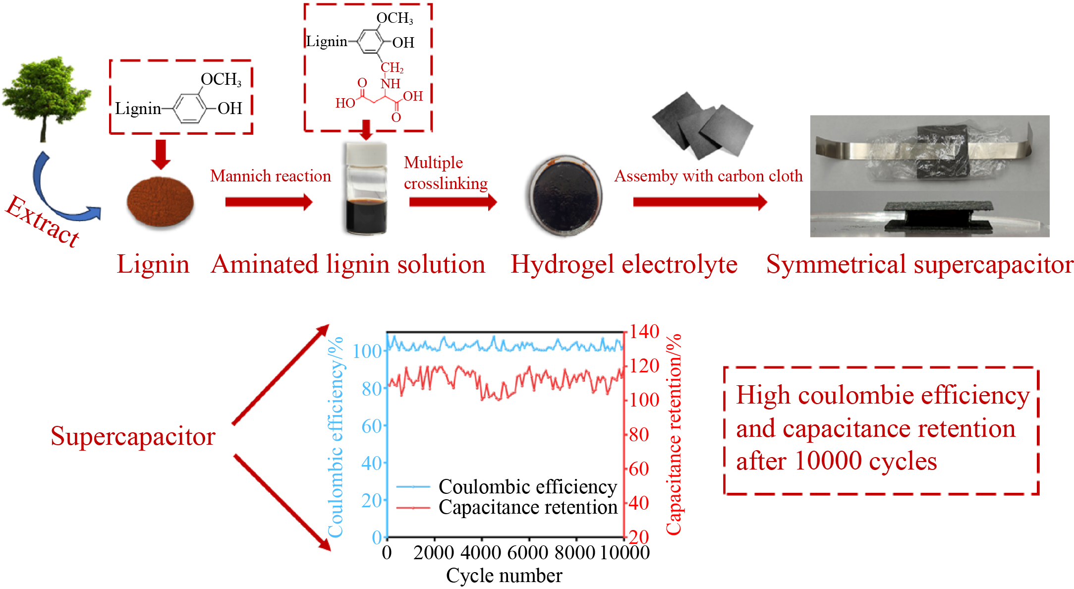 Although lignin is the second most abundant forest biomass polymer, it has been largely neglected in hydrogel electrolytes due to its insolubility and inflexibility. In this study, a double-crosslinked hydrogel was prepared using aspartic acid-modified lignin and sodium alginate, significantly improving the mechanical properties. The hydrogel exhibited an exceptional strain of 3008% and a tensile strength of 0.03 MPa, demonstrating its remarkable mechanical properties. In addition, high ionic conductivity (11.7 mS∙cm–1) was obtained due to the abundant presence of hydrophilic groups in the hydrogel. The hydrogel-assembled supercapacitor manifested an impressive specific capacitance of 39.46 F∙g–1. Notably, the supercapacitor showed a wide potential window of 0–1.5 V and achieved a maximum energy density of 5.48 Wh∙kg–1 at the power density of 499.9 W∙kg–1. The capacitance retention remained at 115% after 10000 charge-discharge cycles. Finally, the coulombic efficiency was almost 100% during the cycles. Upon reaching a bending angle of 90°, the specific capacitance retention remained impressively high at 94%. These results suggest that the supercapacitor cans maintain normal electrochemical performance under extremely harsh conditions.