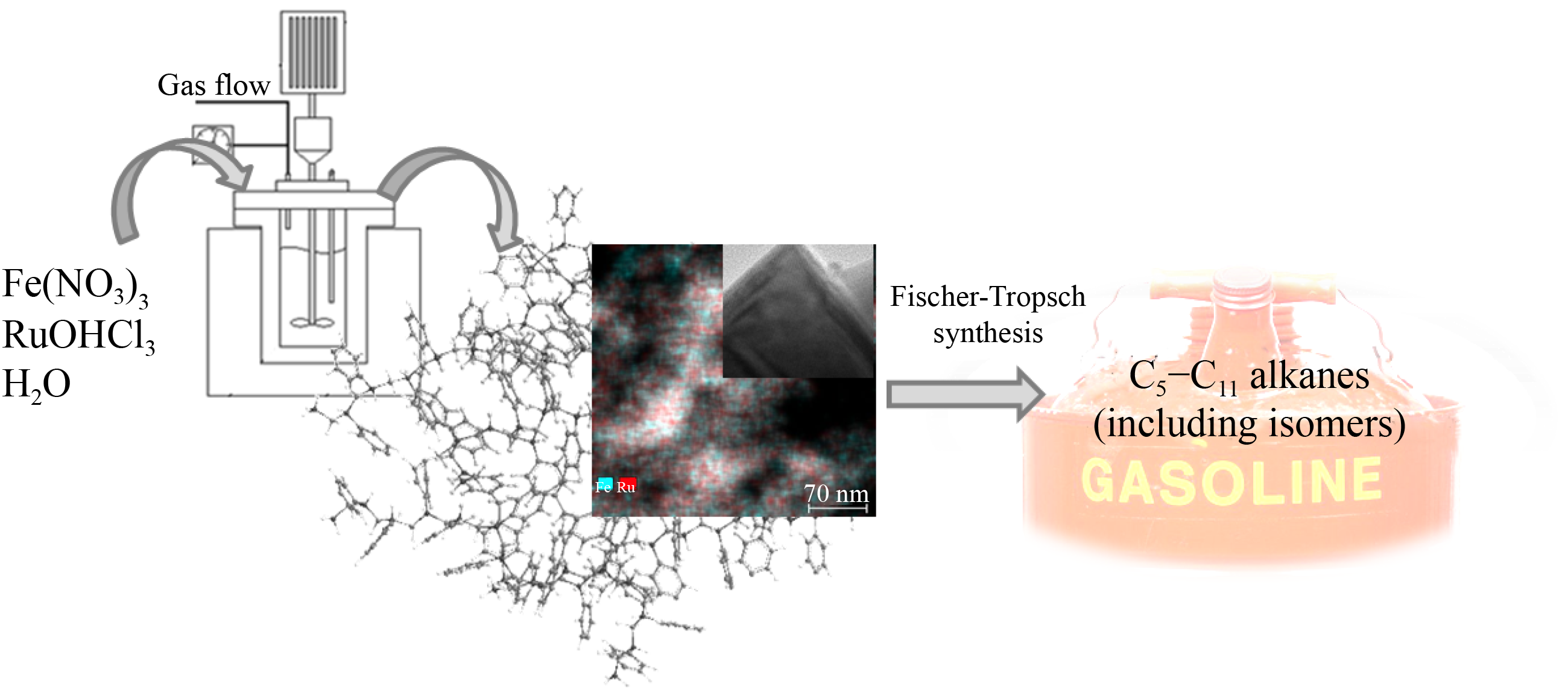 In this work, Fe/Ru-catalyst supported on hyper-crosslinked polystyrene (HPS) synthesized via hydrothermal deposition was proposed for the Fischer-Tropsch synthesis (FTS) to obtain a high yield of gasoline-ranged hydrocarbons. According to the characterization results, the obtained monometallic 2%Fe-HPS catalyst contains Fe3O4 particles with a multimodal distribution (mean particle size of 11, 30, and 45 nm). The addition of Ru leads to a decrease in the particle size with a narrower distribution (ca. 5 nm). Ru was shown to serve as a nucleating agent for Fe3O4 crystalline since it has a higher affinity to the HPS surface and strongly anchors to the benzene rings of the polymer. This prevents a leaching of the active phase from the support increasing the catalyst stability. Ru addition also brings supplemental sites for CO and H2 chemisorption resulting in 1.5-fold increased activity in FTS reaction compared to monometallic 2%Fe-HPS composite. 2%Fe-1%Ru-HPS composite showed ~20% higher selectivity toward the formation of C5–C11 alkanes at about 30% conversion of CO in comparison with monometallic one. Moreover, the branched hydrocarbons with a selectivity of approximately 17.5 mol% were observed in the FTS products in the presence of a 2%Fe-1%Ru-HPS catalyst.