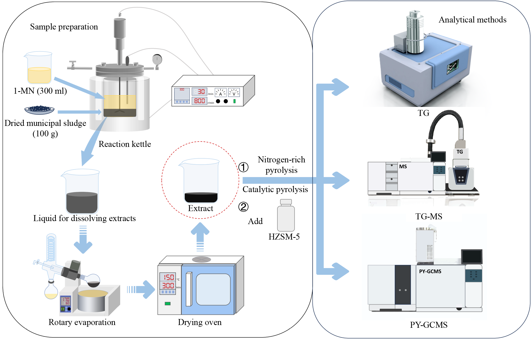 Municipal sludge (MS) extract obtained by degradative solvent extraction has the typical fuel characteristics of high nitrogen content, zero moisture, and low ash, which is suitable for producing valuable nitrogen-containing chemicals. This study compared the nitrogen-rich pyrolysis characteristic of MS extracts using thermogravimetric/thermogravimetric-mass spectrometry/pyrolysis-gas chromatography-mass spectrometry. The composition of bio-oil from catalytic pyrolysis of MS extracts with HZSM-5 was studied, and the pyrolysis kinetic models was established. The results show that different from the raw MS pyrolysis, the MS extracts pyrolysis all had two main peaks with similar values in the range of 140–530 °C (Stage L and Stage W). NH3 is mainly released in the range of 140–370 °C (Stage L), and the nitrogen-containing compounds content in the bio-oil in this stage is 41.81%. After adding HZSM-5, the weight loss rate in Stage L decreased by 21.97%, while that in Stage W increased by 10.04%. An obvious weight loss peak (30.32%) appeared at the temperature of 530–900 °C, which is due to the increased fixed carbon content (increased by 16.07%) of the bio-oil from catalytic pyrolysis. The number of components in the nitrogen-containing compounds decreases much, however, its yield increases by 9.45% due to the transformation of nitrogen by the catalyst effect of HZSM-5 adding.