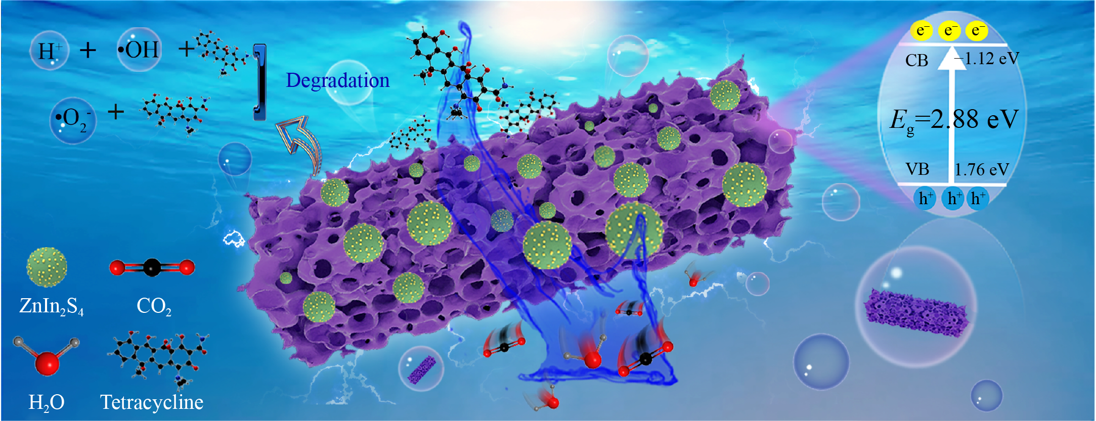 Tetracycline is a broad-spectrum antibiotic that can rapidly inhibit bacterial growth, but its excessive usage and improper handling can lead to its discharge into water, soil, and other ecosystems, posing a significant hazard to ecology and human health. Photocatalysis is considered the most attractive solution for addressing this problem. However, most photocatalysts suffer from nanoparticle agglomeration, high electron-hole recombination rates, and low degradation efficiency. Herein, we offer a straightforward in situ hydrothermal phase separation strategy for synthesizing ZnIn2S4 particles on cellulose/chitosan composite sponges for the effective adsorption and degradation of tetracycline in wastewater. The prepared ZnIn2S4 composite sponge displayed a remarkably porous structure (with pore diameters of 150–500 μm), uniformly distributed ZnIn2S4 nanoparticles (with diameters of approximately 15 nm), a narrow bandgap (2.88 eV), and exceptional compressibility. Owing to these characteristics and the affinity sites of the polysaccharide sponge skeleton, ZnIn2S4 composite sponges represent an innovative model of synergistic adsorption-photocatalytic degradation. The prepared ZnIn2S4 composite sponge had a removal efficiency of up to 91.5% for tetracycline under sunlight irradiation and remained effective after eight consecutive cycles. This study highlights the potential application prospects of ZnIn2S4 composite sponges in the sustainable and environmentally friendly treatment of antibiotics.