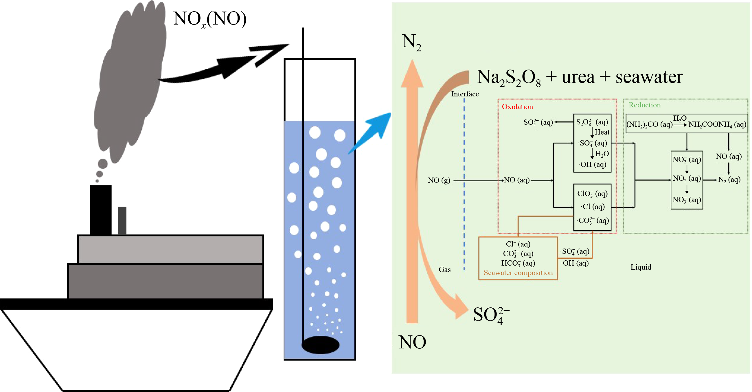 The sodium persulfate (Na2S2O8)-urea system has been proven to be an excellent scrubbing solution for the wet removal of NO. Commonly, seawater is used as a wet carrier in marine applications. To further explore the feasibility of marine denitrification using Na2S2O8-urea system, this study proposed the Na2S2O8-urea-seawater composite redox system for NO removal from the marine exhaust gas. The effects of seawater carrier, reaction temperature, Na2S2O8 concentration, urea concentration, pH value, and NO concentration on NO removal were investigated. Additionally, the NO3− concentration in the solution was measured. Results showed that the lowest normalized NO concentration was 0.099, with the corresponding mass of NO absorbed per unit volume of solution reaching 0.108 g·L−1. The addition of seawater carrier and incremental reaction temperature, Na2S2O8, and urea concentration promoted the NO removal performance. When the pH value increased within the range of 4–7, the NO removal performance decreased. The NO removal performance increased as the pH value further increased to 8, but decreased again when the pH value increased to 11. An increase in NO concentration was detrimental to NO removal. The Cl−, HCO3−, and CO32− in seawater could augment the total concentration of active free radicals to improve denitrification performance.
