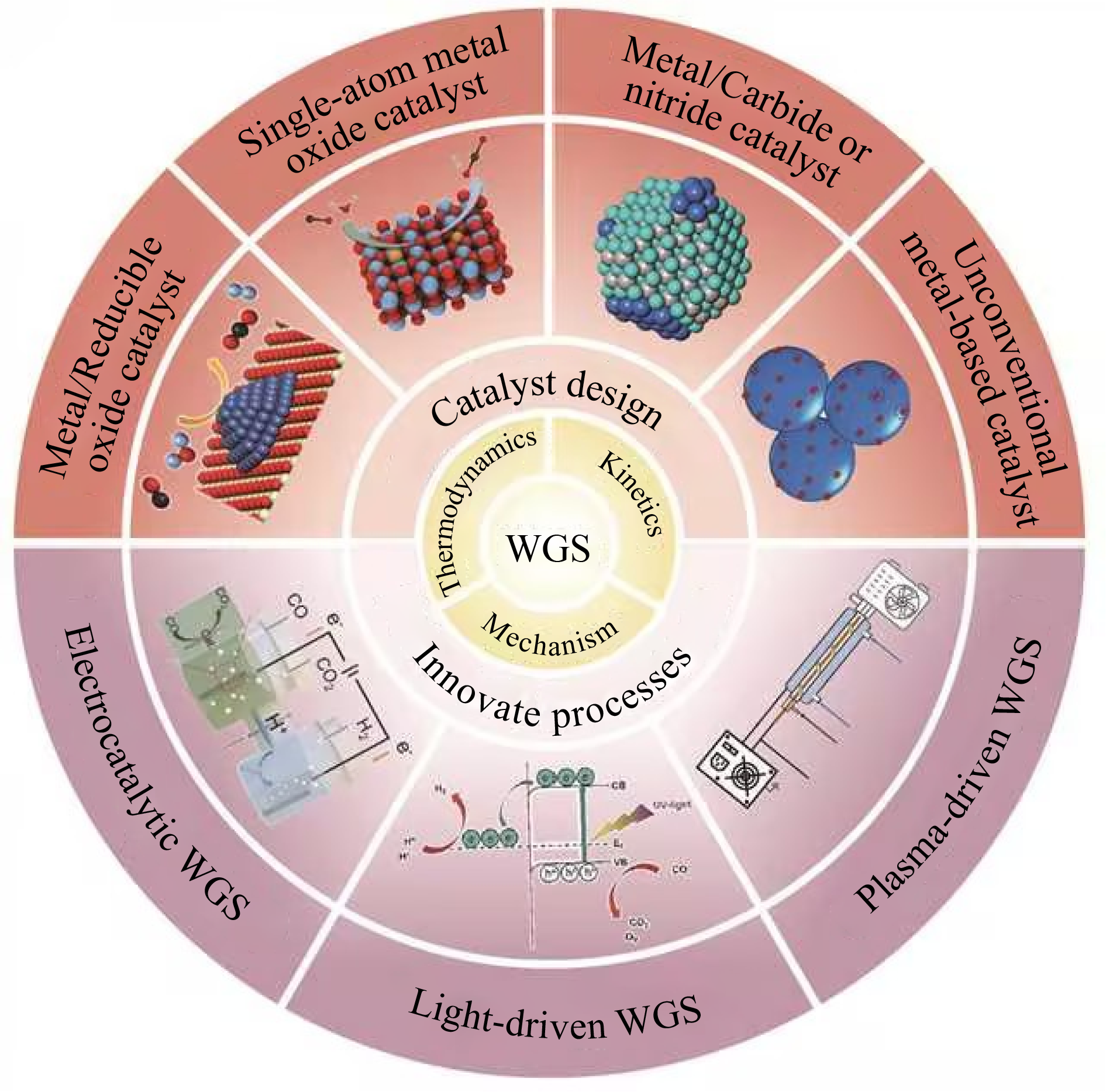 The water-gas shift (WGS) reaction plays a pivotal role in various industrial processes, particularly in hydrogen production and carbon monoxide removal. As global energy demands rise and environmental concerns intensify, the development of efficient and sustainable catalysts for the low-temperature WGS (LT-WGS) reaction has gained significant attention. This review focuses on recent advancements in water-gas-shift catalyst design for low-temperature conditions and emerging renewable energy-driven catalytic processes, such as photocatalysis, electrocatalysis, and plasma catalysis for the WGS reaction, which are less commonly explored in existing reviews. We systematically analyze mechanisms studies of LT-WGS, rational catalyst design strategies, and recent frontier advances in the development of highly efficient catalysts. Furthermore, this review provides actionable insights for refining catalyst architectures, enhancing operational efficiency, elucidating reaction pathways, and pioneering hybrid technologies, all contributing to further advancements in this field.