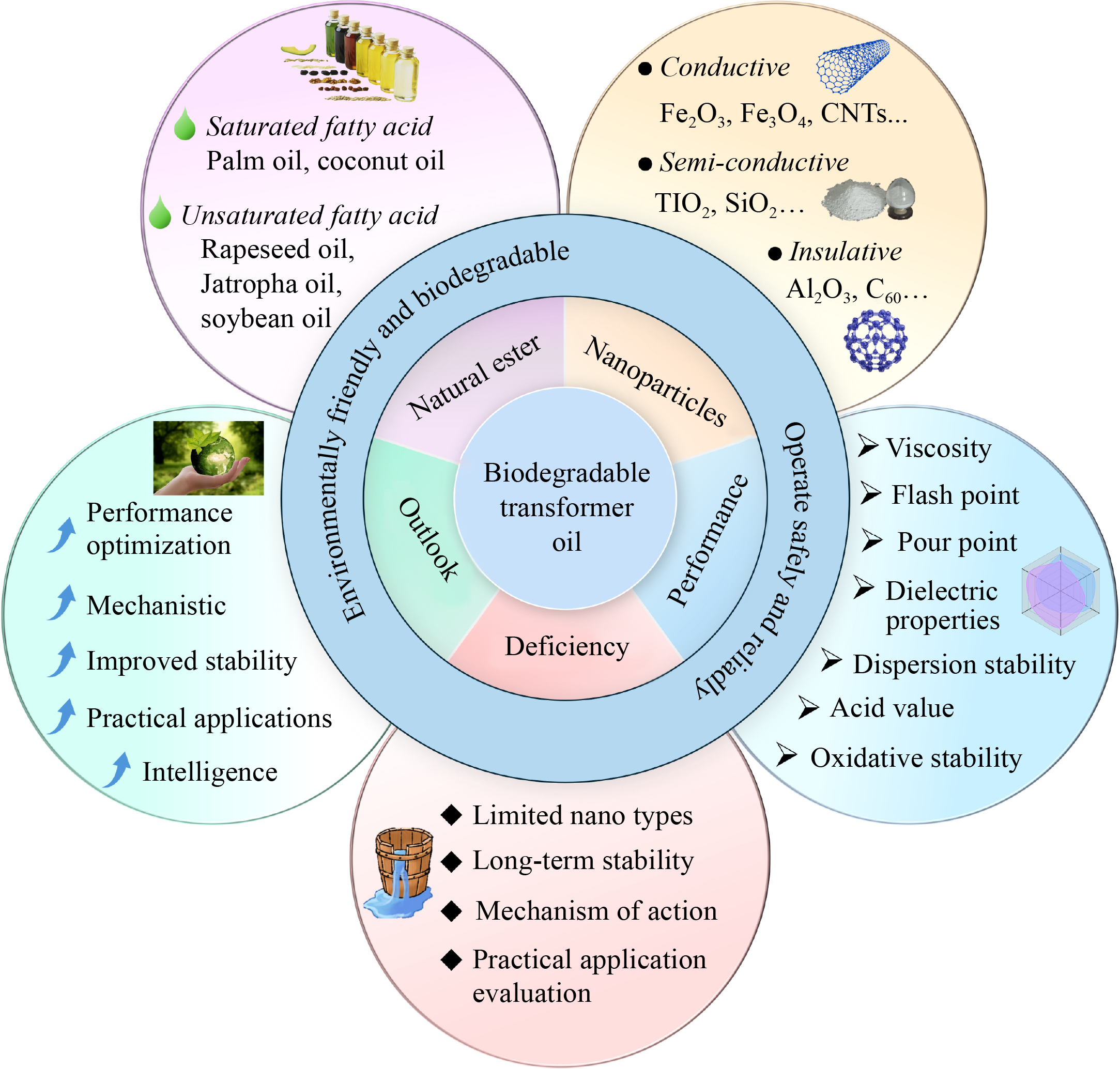 Download coverNatural esters exhibit excellent flame retardant and biodegradability, which help minimize power accidents and reduce environmental impact. These qualities make natural esters a promising alternative to conventional transformer insulating oils. However, the practical applications of natural esters in power equipment have been significantly restricted by their inherent limitations, including elevated viscosity, high dielectric loss, and poor oxidative stability. Nano-modification technologies present a novel methodological approach to solve these inherent constraints. A systematic analysis of the latest research developments in nano-modified natural ester transformer oils is provided in this review. The properties of various natural esters are examined, and their suitability as base fluids is evaluated, while the modification effects and mechanisms of typical nano-additives are comprehensively reviewed. The key role of nano-modification technology in improving the overall performance of natural esters is elucidated through detailed analysis of how nanoparticles influence physical properties, dielectric properties, and oxidative stability. In addition, the practical challenges facing nano-modification technology are addressed, providing valuable theoretical guidance for future developments in this field.