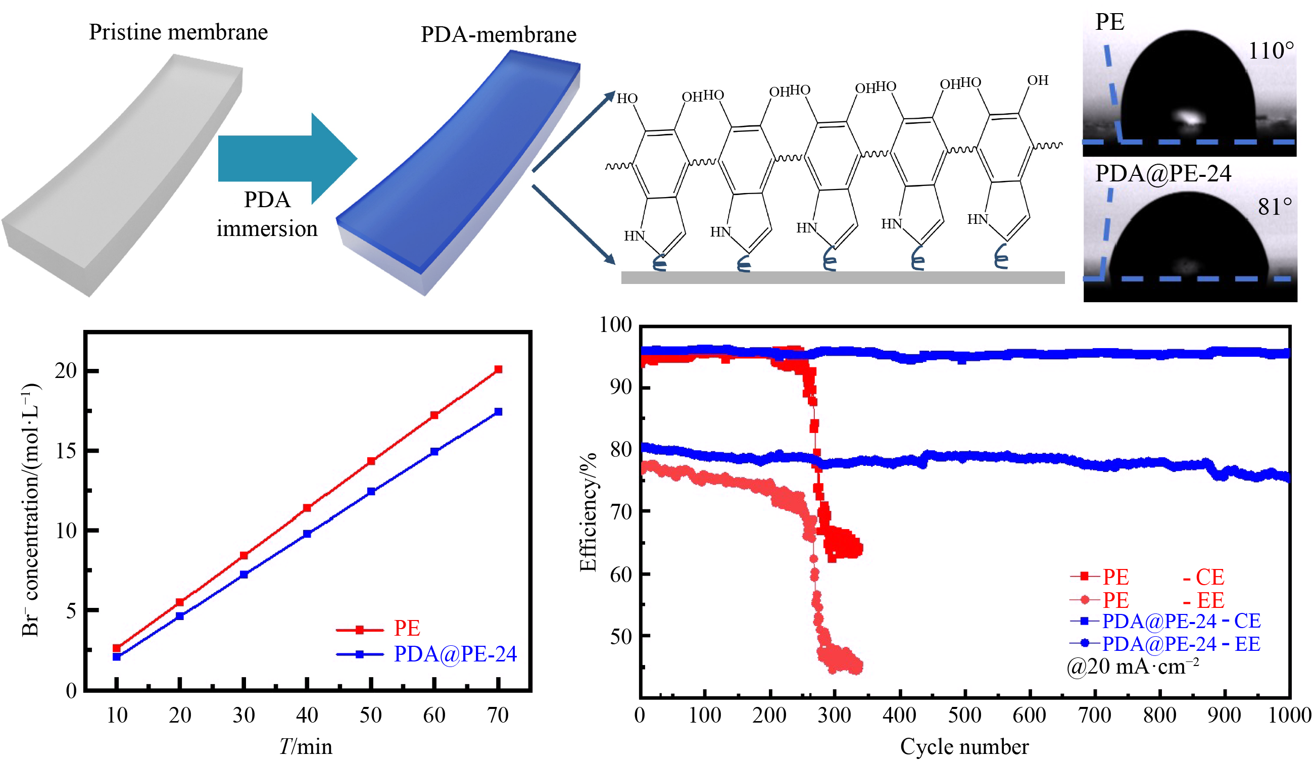 Zinc-bromine flow batteries are considered as one of the most promising energy storage devices with high energy density and low production price. However, its practical application is hampered by the short cycle life, which is mainly due to the uneven zinc deposition and the shuttle effect of bromide ions. Modification of membranes, an important part of zinc-bromine flow batteries, is a common approach to address these issues. In this study, inspired by the adhesion mechanism of filament proteins secreted by marine mussels, we propose a novel method for modifying polyethylene membranes with polydopamine. The self-polymerization of dopamine on a polyethylene membrane surface is simple and mild compared to traditional methods. This dopamine-based modification enhances the hydrophilicity of polyethylene membrane, improves ion transport, and reduces the pore size of the membranes, effectively blocking bromine ion shuttling. Additionally, polydopamine modification promotes uniform zinc deposition, further improving the battery performance. Consequently, the resulting PDA@PE-24 membrane demonstrates a significant improvement in both voltage and energy efficiencies, reaching 83.5% and 79.7%, respectively, under 20 mA·cm–2, compared to the 80.3% and 76.5% voltage and energy efficiencies, respectively, for unmodified polyethylene membranes. Furthermore, the cycle life of a single cell increased 4-fold, operating continuously for more than 2000 h.