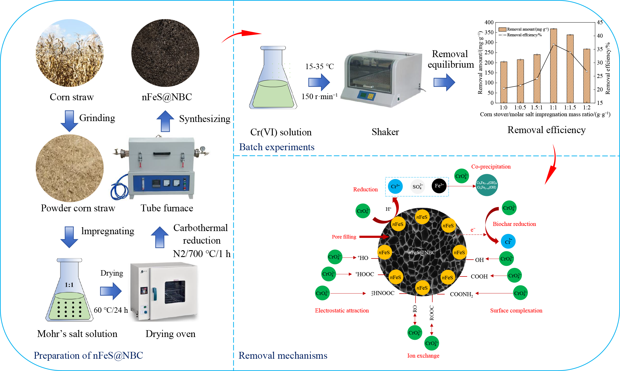 In this work, a novel nitrogen-doped biochar-supported nanoscale ferrous sulfide composite (nFeS@NBC) was fabricated by pyrolyzing corn straw pretreated with Mohr’s salt through a one-step carbothermic reduction process, which was applied in the efficient disposal of hexavalent chromium (Cr(VI))-containing wastewater. The key effects of impregnation ratio and pyrolysis temperature on the properties and removal performance of nFeS@NBC for Cr(VI) were subsequently investigated. The properties of nFeS@NBC were characterized through a series of techniques. It indicated that FeS nanoparticles were successfully loaded and –NH2 functional groups effectively formed on the biochar surface, which enhanced the removal performance of nFeS@NBC for Cr(VI) from wastewater. The removal performance of nFeS@NBC for Cr(VI) was systemically evaluated at different experimental conditions and in the presence of major co-existing ions. Adsorption kinetics was best suited to the pseudo-second-order model. Additionally, Langmuir isotherms model could well explain the adsorption experiment data for the removal of Cr(VI) by nFeS@NBC with the highest adsorption capacity of 373.85 mg·g–1. According to the thermodynamic study, nFeS@NBC dominated the adsorption of Cr(VI) through an endothermic and spontaneous process. The adsorption and reduction served as the main removal mechanisms of nFeS@NBC for aqueous Cr(VI). nFeS@NBC could be used repetitively for its regeneration. Thus, the above results showed that it was feasible and efficient to remove Cr(VI) by nFeS@NBC, providing a potential green material for environmental remediation.