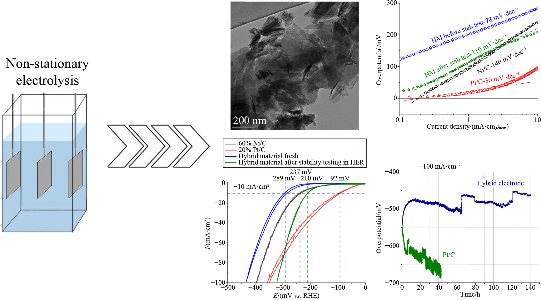 The hybrid material based on polyelectrolyte complexes of chitosan with oxycompounds of cobalt and nickel was electrodeposited on a stainless steel plate using the method of non-stationary electrolysis. The hybrid material layer was investigated by scanning electron microscopy, atomic force microscopy, transmission electron microscopy, X-ray diffraction, X-ray photoelectron spectroscopy, Brunauer-Emmett-Teller method, Fourier transform infrared spectroscopy, and Raman spectroscopy. The electrocatalytic properties of the hybrid material were studied in the hydrogen evolution reaction in alkaline electrolyte (1 mol·L−1 NaOH). It was determined that during the initial four-hour period of the hydrogen evolution process, the overpotential underwent a substantial decline, remaining constant for a minimum of 17 h thereafter, from 289 up to 210 mV at −10 mA·cm−2. After a long-term hydrogen evolution, the activity of the hybrid material electrode exceeded hydrogen evolution reaction activity by 20% Pt/C commercial catalyst at a high current density of −100 mA·cm−2.