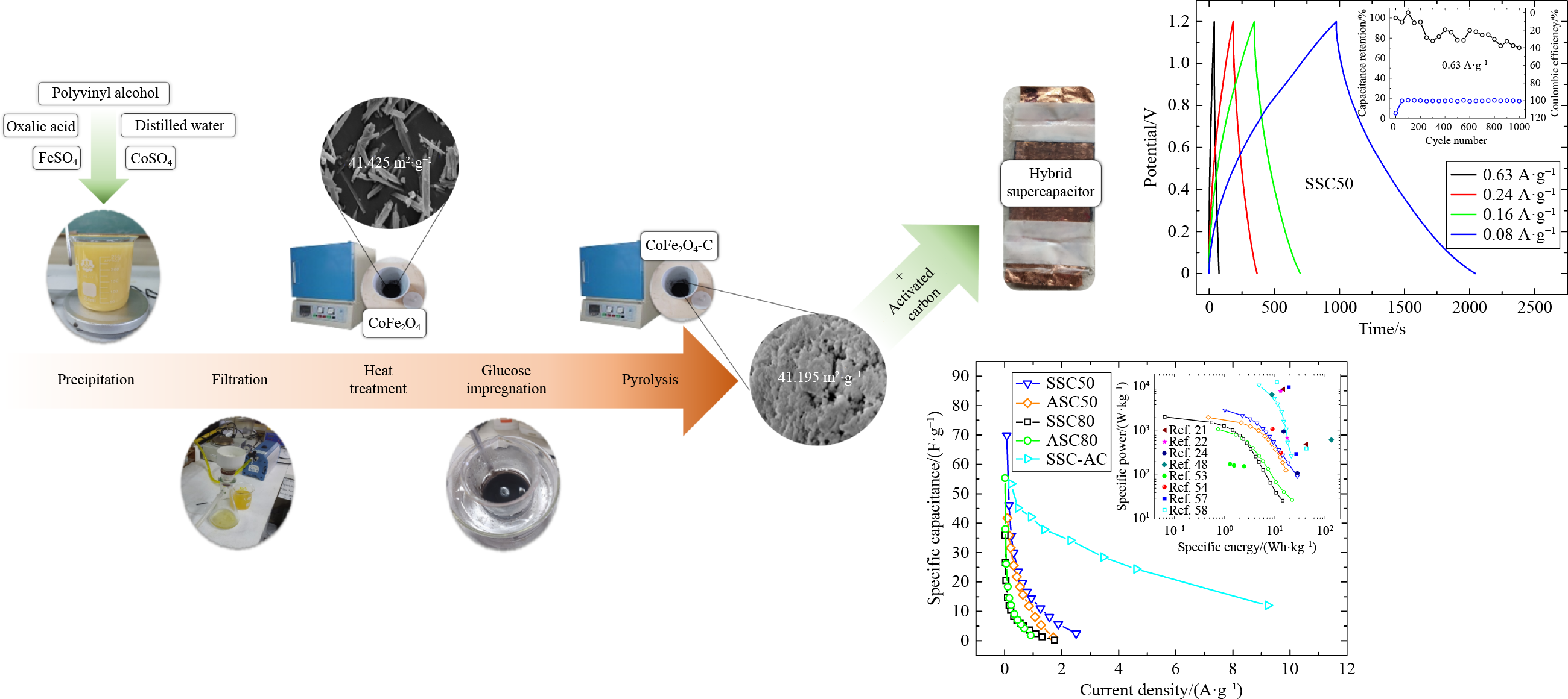The need for efficient energy storage systems has promoted the development of supercapacitors. Researchers have recently focused on building hybrid supercapacitors and synthesizing electrode materials using ecological and easily scalable methods. This work presents the development of hybrid supercapacitors based on cobalt ferrite-carbon composite. The spinel ferrite was synthesized by co-precipitation followed by heat treatment, and a ferrite-glucose precursor was used to obtain a mesoporous composite with a specific surface area of 41.195 m2·g–1. Adding carbon does not structurally modify the cobalt ferrite but significantly improves the electrochemical properties. The electrochemical characterization in a three-electrode cell yielded a maximum specific capacitance of 548.1 F·g–1 at a current density of 14.5 A·g–1. The composite was mixed with sustainable activated carbon in different proportions to assemble solid-state hybrid supercapacitors. A maximum specific capacitance and energy of 69.8 F·g–1 and 27.9 Wh·kg–1 were obtained with a symmetric 1.2 V device, corresponding to a specific power of 94 W·kg–1. These results show that it can develop hybrid supercapacitors based on the CoFe2O4-C composite, synthesized by a simple, low-cost, and environmentally friendly method.