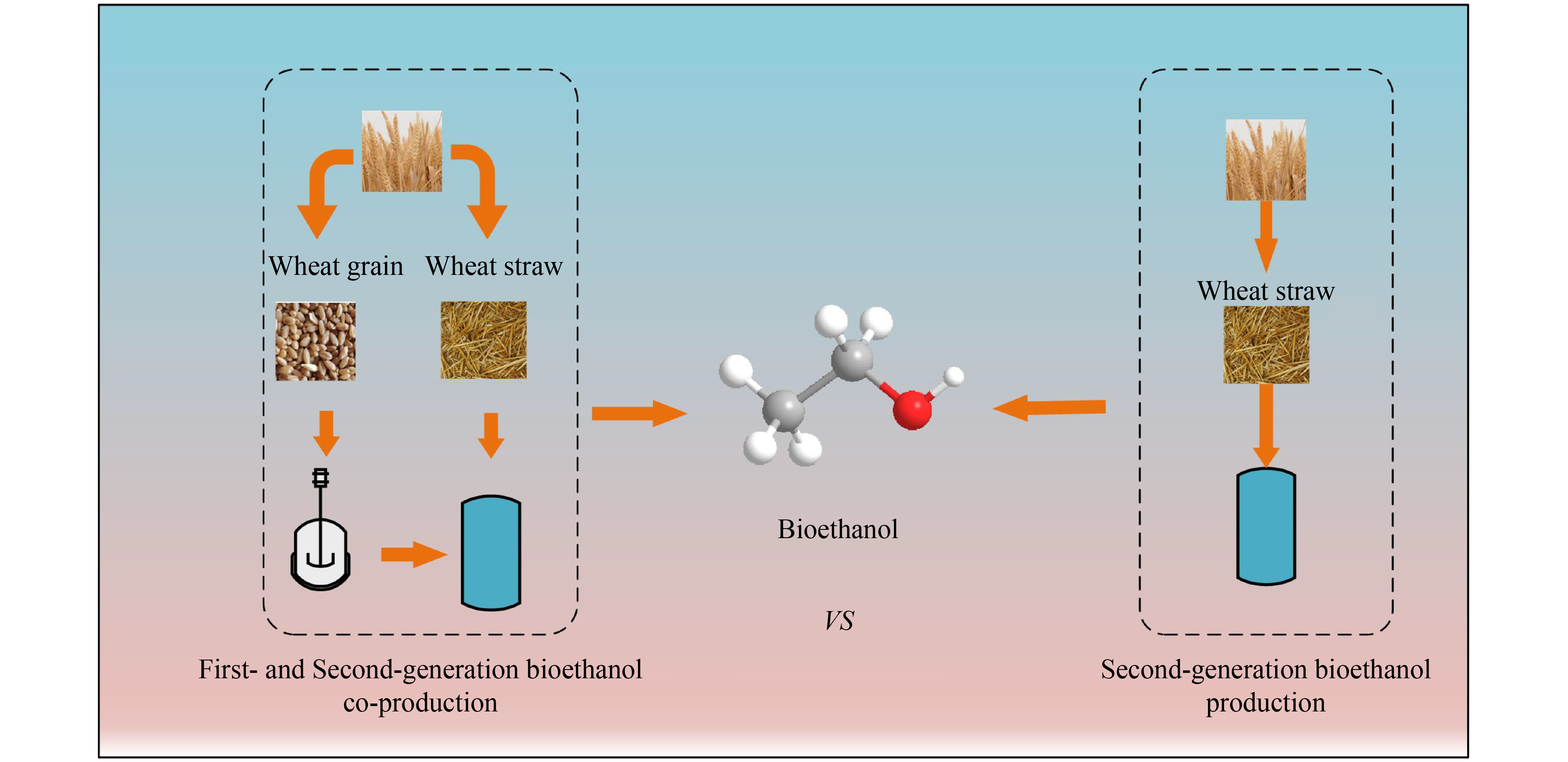 This study evaluates the techno-economic feasibility and environmental implications of integrating first-generation (1G) and second-generation (2G) bioethanol co-production using wheat grain and wheat straw (WS) as feedstocks. Three pretreatment methods—formic acid, sodium chlorite, and alkaline hydrogen peroxide (AHP)—were investigated, with AHP identified as the most industrially viable due to its mild conditions, high cellulose retention (73%), and reduced wastewater generation. The results indicated that the integrated 1G + 2G process exhibited high bioethanol production capacity (241300 t·y–1) and mass yield (22.74%) under the conditions of 1200 t·d–1 of wheat and 2000 t·d–1 of WS. Furthermore, an energy recovery potential of 60.51%, alongside a 60.65% reduction in CO2 emissions could be achieved. 1G + 2G process has a competitive minimum ethanol selling price (MESP: $431·t–1), high internal rate of return (37%), and return on investment (76%). Life cycle assessment highlighted terrestrial ecotoxicity potential (35%) and freshwater ecotoxicity potential (32%) as dominant environmental impacts, driven by nitrogen fertilizer use and fuel combustion efficiency. Sensitivity analysis showed feedstock costs and ethanol pricing as critical economic drivers, while reducing nitrogen fertilizer application and optimizing combustion efficiency were key to mitigating environmental burdens. This work provides actionable insights for advancing integrated biorefineries with enhanced yield, economic viability, and sustainability.