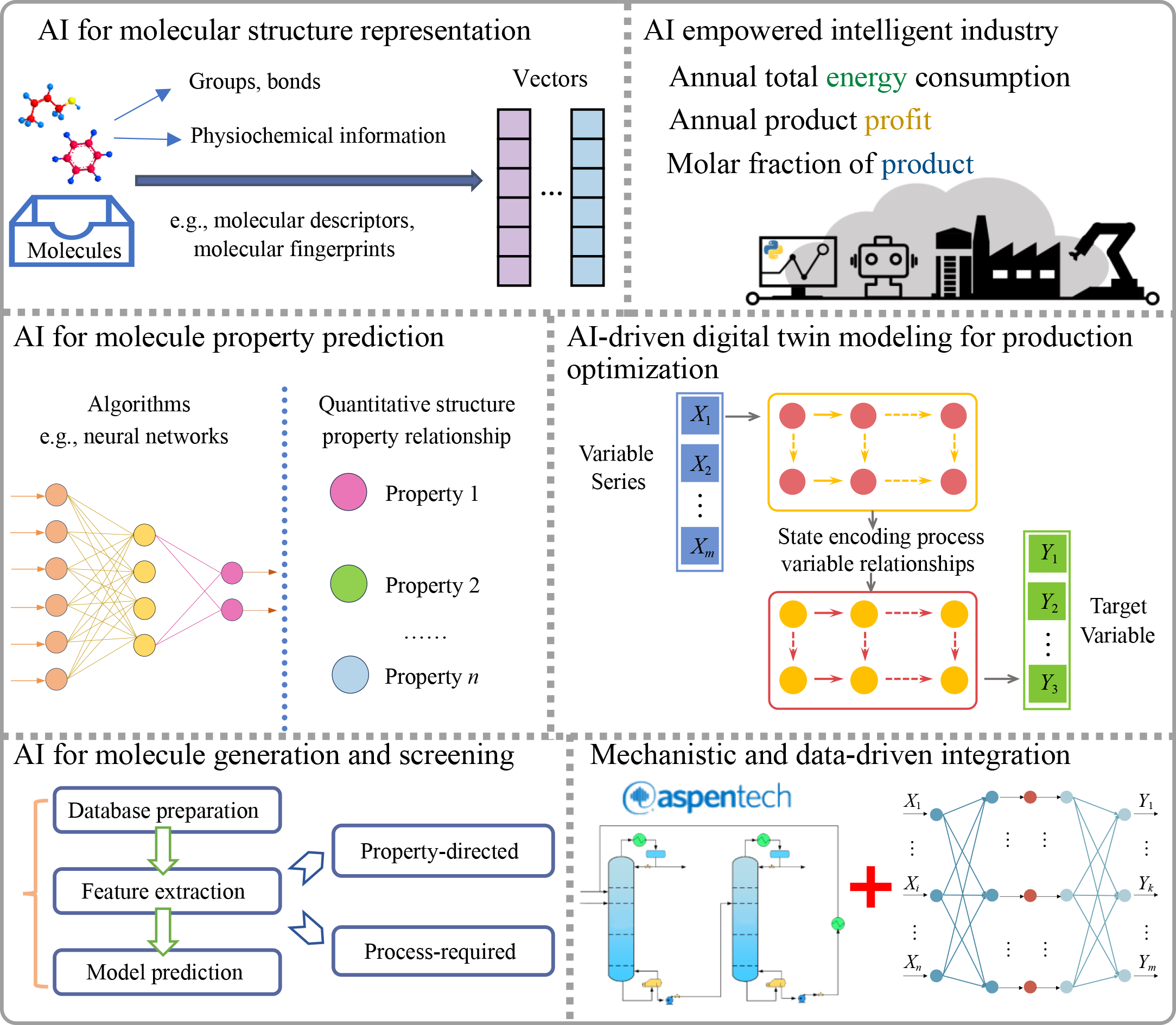 With the advent of the fourth technological revolution, the new generation of artificial intelligence (AI) has imparted new significance and opportunities to the modeling of momentum, heat, and mass transfer, as well as chemical reaction processes with the realm of chemical engineering. AI techniques are being widely employed in the chemical industry and are constantly evolving to offer more effective solutions for tackling practical challenges. This review delves the transformation of the chemical industry from traditional digital simulations to advanced AI-based approaches, targeting high efficiency and low carbon emissions across the scale from molecules to factories. Particular emphasis is mainly placed on the research carried out within the research group of Weifeng Shen. At the molecular level, the intelligent capture of molecular characteristics and the precise determination of structure-property relationships have reached a mature stage. Furthermore, multifunction-driven reverse molecular design for solvents, reaction reagents, and other substances has been accomplished through AI-based high-throughput screening and generative models. To improve the safety, environmental friendliness, and carbon reduction performance of chemical separation processes, a series of innovative reinforcement strategies have been put forward, with a primary focus on the systematic optimization of solvent design. On the process scale of actual production, it frequently occurs that the constructed mechanism model fails to align with the actual system behavior, thereby restricting the industrial application of the model. To solve this issue, mechanism-data hybrid-driven frameworks have been successfully developed, leveraging AI-enhanced prediction, diagnosis, optimization, and control for complex separation systems in practice. Finally, as a bridge connecting big data intelligent technology and actual industrial processes, dynamic digital twin modeling is discussed for its potential to boost efficiency and sustainability in the chemical industry.