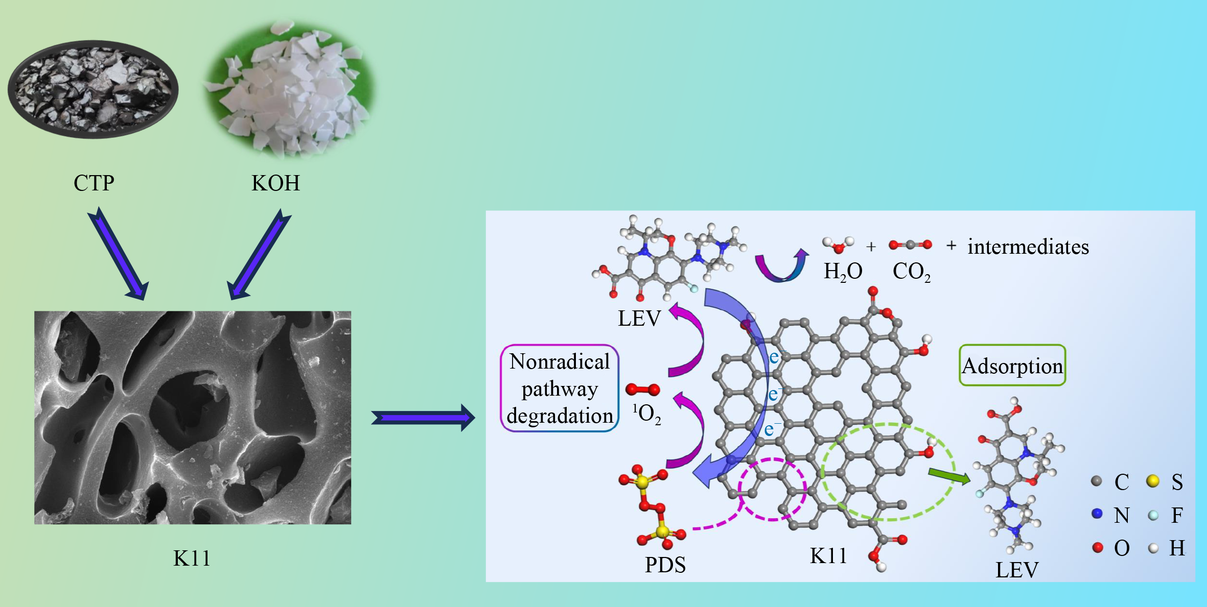 The persistent presence of levofloxacin (LEV) residues in aquatic environments considerably threatens ecological safety and human health, owing to the potential spread of microbial resistance genes, creating an urgent need for effective removal technologies. In this study, porous carbon materials with high specific surface areas were synthesized using a one-step KOH activation method, with medium-low-temperature coal tar pitch serving as a carbon precursor. In addition, the performance and mechanism of LEV degradation via peroxydisulfate (PDS) activation were systematically explored. Characterization techniques such as X-ray diffraction, Raman spectroscopy, N2 adsorption-desorption analysis, and field-emission scanning electron microscopy revealed that K11 possessed abundant pores, a specific surface area of up to 1220 m2·g–1, and numerous defects, which collectively provided a structural basis for its catalytic activity. Degradation experiments demonstrated that the LEV removal rate exceeded 91% under conditions of a 0.2 g·L–1 PDS dosage, a 0.1 g·L–1 K11 dosage, pH levels ranging from 3 to 9, and a temperature of 30 °C, with robust resistance to interference from co-existing ions and humic acid. Even in real water bodies, a removal rate of over 77.84% was maintained. Free-radical quenching experiments and electron spin resonance assays confirmed that the reaction proceeded predominantly via non-radical pathways, primarily involving the generation of singlet oxygen by PDS, along with a minor contribution from direct electron transfer pathways. High-performance liquid chromatography-mass spectrometry identified LEV degradation intermediates, suggesting that the degradation pathways include piperazine ring cleavage, defluorination, and oxidation of the quinolone backbone. This study offers theoretical insights and technical guidance for the resource utilization of coal tar pitch and the control of antibiotic pollution.