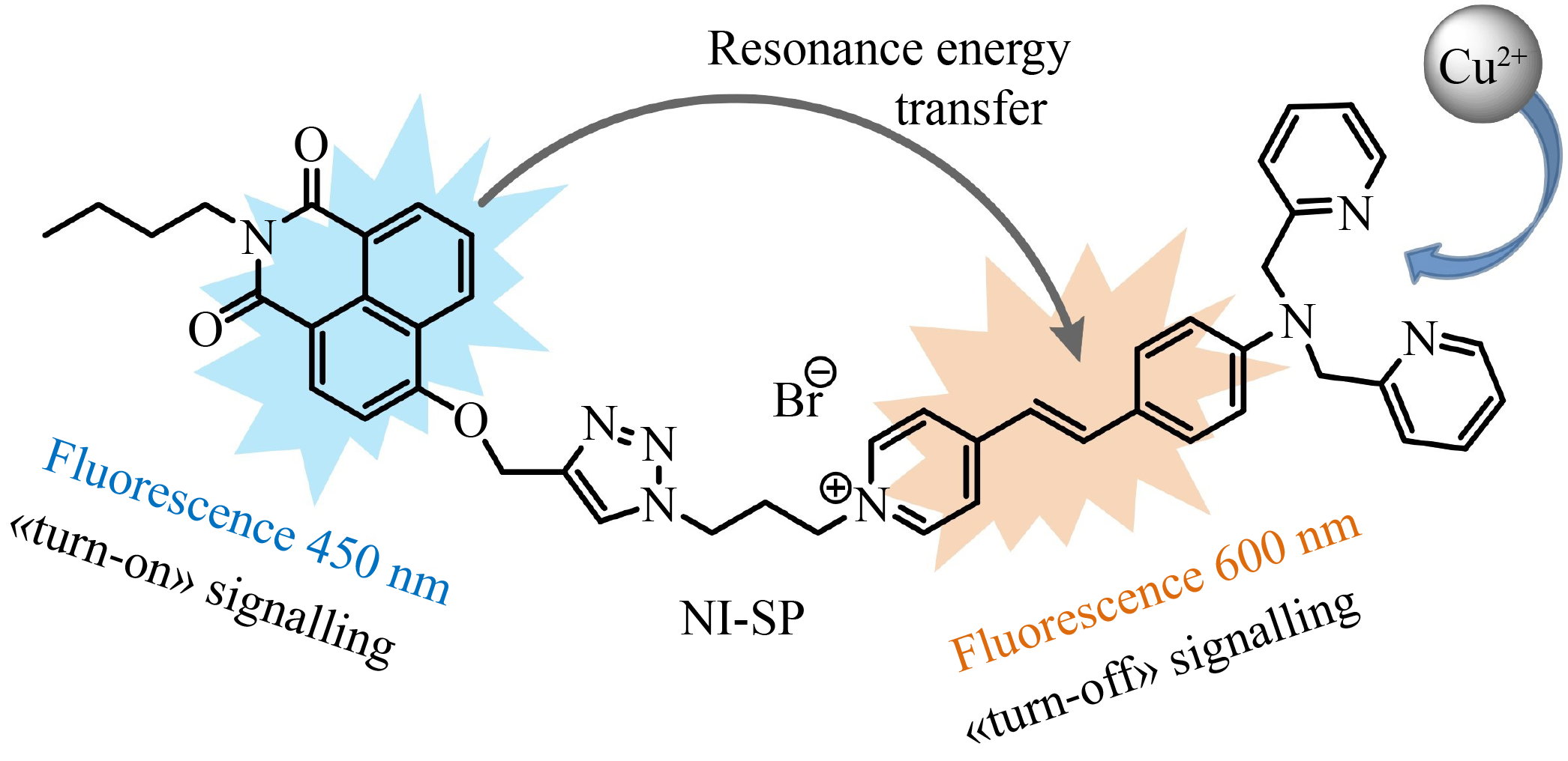 Development of ratiometric fluorescent probes for Cu2+ in aqueous solutions and biological systems remains the challenging task, given that Cu2+ commonly acts as an efficient fluorescence quencher. In this work, a novel dyad compound NI-SP bearing energy donor naphthalimide and energy acceptor styrylpyridine chromophore has been prepared using azide-alkyne click reaction. The photophysical properties of NI-SP and its coordination with Cu2+ have been investigated by the absorption and fluorescent spectroscopy. Upon addition of Cu2+ to a solution of NI-SP, the long wavelength emission peak of styrylpyridine (600 nm) was quenched, whereas the fluorescence of naphthalimide (450 nm) was enhanced due to a decrease in resonance energy transfer efficiency between the chromophores in the (NI-SP)·Cu2+ complex. The observed spectral changes enable ratiometric detection of Cu2+ by the registration of the ratio of fluorescence intensities I450/I600. The probe exhibited high selectivity toward Cu2+ in the tested conditions. The detection limit was determined at 120 nmol·L–1, and the stability constant for (NI-SP)·Cu2+ was found to be 3.0 × 106 L·mol–1. Bioimaging experiments showed the NI-SP could penetrate human lung adenocarcinoma A549 cells, accumulate in mitochondria, and respond to the presence of Cu2+ via the changes in the fluorescence intensity of styrylpyridine fragment.
