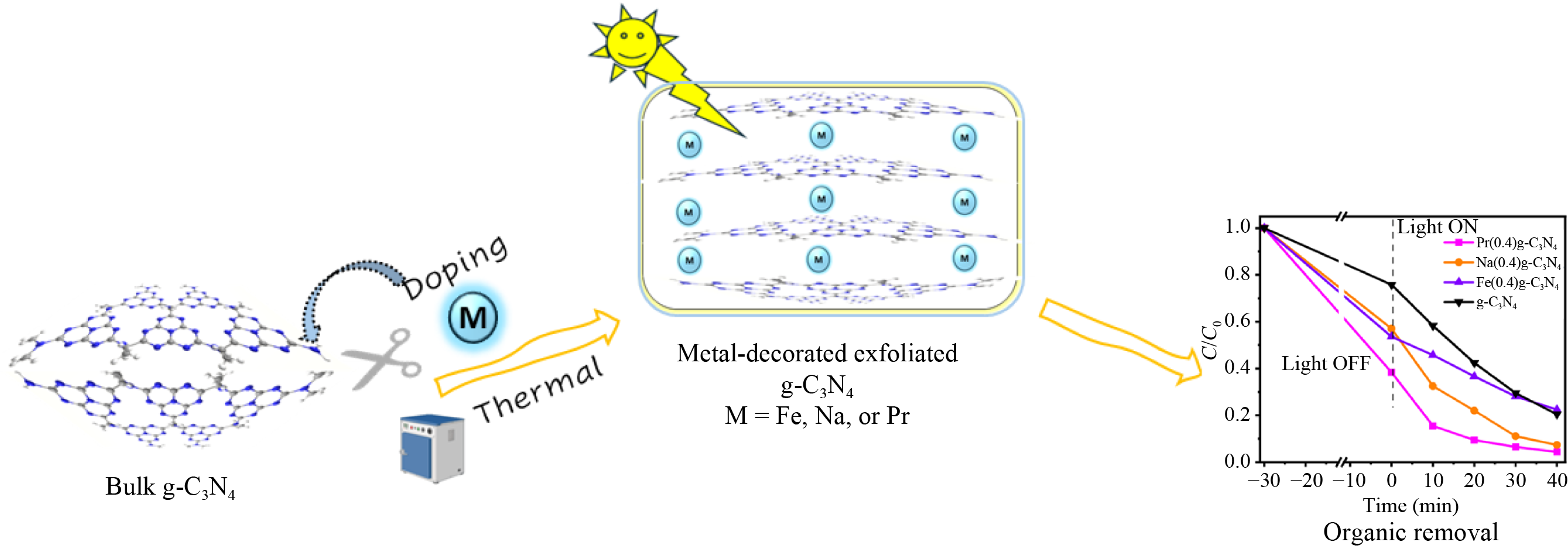 This study systematically studied the effects of Pr, Fe, and Na as representative rare earth, transition, and alkali metal dopants, respectively, on the photocatalytic activity of exfoliated graphitic carbon nitride (g-C3N4). The doped exfoliated g-C3N4 samples were prepared by integrating precursor ion intercalation into the pre-formed g-C3N4 with thermal treatment. The as-prepared catalysts were examined for crystal, textural, chemical, optical, and photoelectrochemical properties to explore the correlation between dopants and photocatalytic activity of the resulting composites. The detailed analyses revealed that the Pr-doped g-C3N4 exhibited superior photocatalytic activity in degrading methylene blue under visible light, achieving a ~96% removal in 40 min. This was not only better than the activity of g-C3N4, but also much higher than that of Na-doped g-C3N4 or Fe-doped g-C3N4. The kinetic rate constant using Pr-doped g-C3N4 was 3.2, 5.1, and 2.0 times greater than that of the g-C3N4, Fe-doped g-C3N4, and Na-doped g-C3N4, respectively. The enhanced performance was attributed to its inherent characteristics after optimal tuning, including good surface area, improved porosity, enhanced visible light absorption, suitable electronic band structure, increased charge carrier density, promoted charge separation, and reduced charge transfer resistance. In addition, the optimized Pr(0.4)g-C3N4 was used to study the photocatalytic removal of methylene blue in detail under conditions with different initial methylene blue concentrations, types of dyes, catalyst dosages, initial solution pH, counter ions, and water matrices. Our results demonstrated the high photocatalytic activity of Pr(0.4)g-C3N4 under varying conditions, including in real wastewater media, which were collected from our local municipal wastewater treatment plant. The observed good reusability and stability after five cycles of photocatalytic degradation test further suggested a promising potential of Pr(0.4)g-C3N4 for practical application in wastewater treatment.