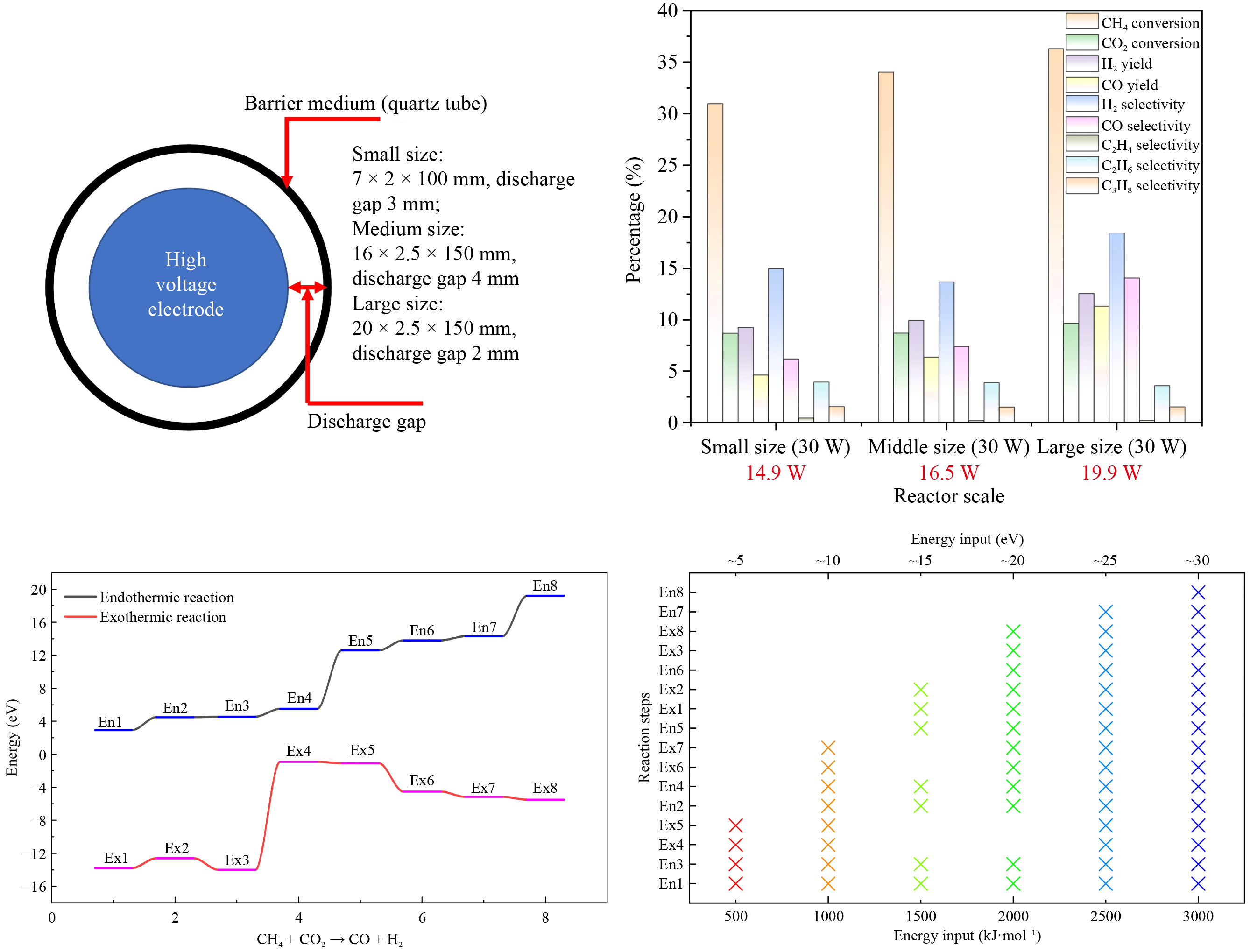 Dielectric barrier discharge plasma-driven dry reforming of methane is a promising technology for syngas production. However, plasma involves complex chemical reaction pathways, non-thermal equilibrium kinetic characteristics, and interactions with catalysts, which together affect the catalytic efficiency of the dielectric-barrier plasma driven dry reforming of methane reaction and constitute its main technical challenges. This study systematically investigates the effect of critical parameters-including reactor dimensions, input power, gas flow rate, gas composition, and catalyst type-on CH4 and CO2 conversion as well as syngas selectivity. Through thermodynamic and kinetic analysis, we elucidate the stepwise evolution mechanism of CH4/CO2 reactions under low-temperature plasma conditions. Notably, we incorporated the power law relationship between electron energy and input power into the thermodynamic model, thereby quantitatively revealing for the first time the regulatory effect of input power on the reaction path. This study provides valuable design principles to enhance the efficiency and industrial applicability of dielectric-barrier plasma driven dry reforming of methane processes.