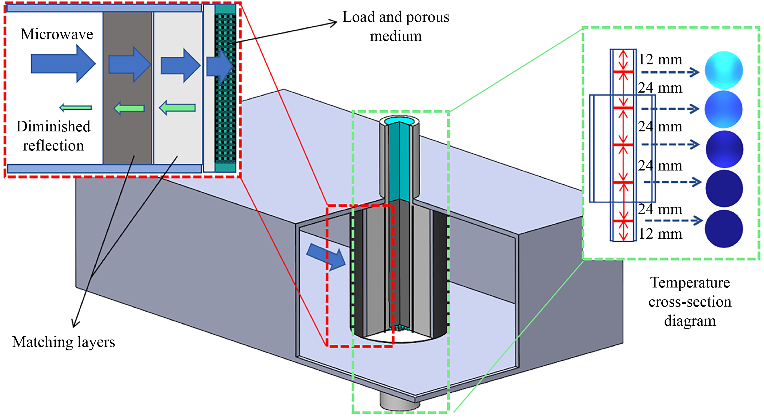 Continuous-flow microwave-assisted heating has been extensively applied in chemical engineering. A common method used for heating fluids is by using a tube in a cavity. However, it is challenging to maintain high heating efficiency owing to the temperature-dependent dielectric properties of different fluids, and the temperature of fluids is usually uneven. In this study, a multilayer ring structure is proposed based on an impedance gradient that covers a tube with a porous material inside it to achieve high heating efficiency and uniformity. A multiphysics model, including electromagnetic fields, fluid heat transfer, and free and porous media flow, was established to simulate the continuous-flow microwave heating process. The dimensions of the multilayer ring structure were optimized and manufactured. Energy utilization efficiency experiments and continuous heating experiments were conducted, which demonstrated that the proposed model achieved an efficiency > 90% with different aqueous ethanol solutions, while maintaining high heating uniformity compared with other heating models. Furthermore, the effects of the tube permittivity and porosity of the porous material on the heating efficiency were investigated to demonstrate the robustness of the proposed model.