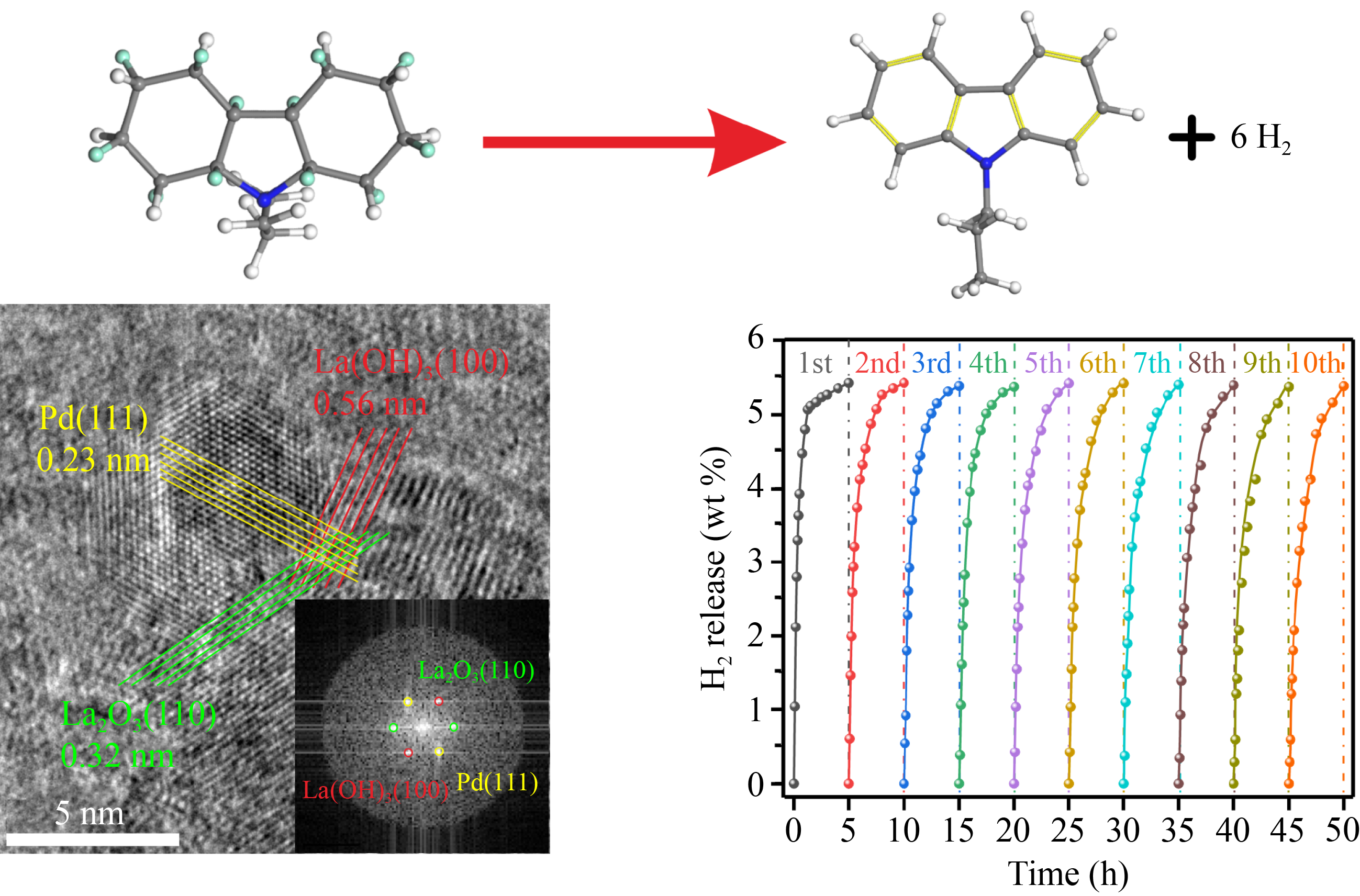 Targeting the demand for efficient dehydrogenation catalysts in liquid organic hydrogen carriers, we synthesized a series of La-doped alumina supports by a co-precipitation/hydrothermal route and deposited Pd nanoparticles to promote 12H-N-propylcarbazole (NPCZ) dehydrogenation. Comprehensive characterization shows that an optimal 10 wt % La loading generates intimately interfaced La2O3 and La(OH)3 nanodomains that anchor highly dispersed Pd particles (~2.2 nm), donate electrons to Pd0, and create bifunctional acid-base sites together with a fast hydrogen-spillover network. These synergistic features accelerate C–H activation and H-migration, enabling Pd/La10AlO to deliver the theoretical H2 release (5.43 wt %) in 150 min at 180 °C with 99% NPCZ selectivity and no activity loss over ten cycles. Kinetic analysis reveals markedly lower apparent activation energies for all three successive dehydrogenation steps, with a ~65 kJ·mol–1 drop in the rate-limiting 4H-NPCZ→NPCZ stage, underscoring the thermodynamic and kinetic benefits conferred by the dual-phase La promoter. This work provides the first mechanistic evidence that coexisting La2O3/La(OH)3 can cooperatively tune the electronic and interfacial structure of Pd/Al2O3, offering clear guidelines for designing durable, high-performance dehydrogenation catalysts for N-heterocyclic liquid organic hydrogen carriers.