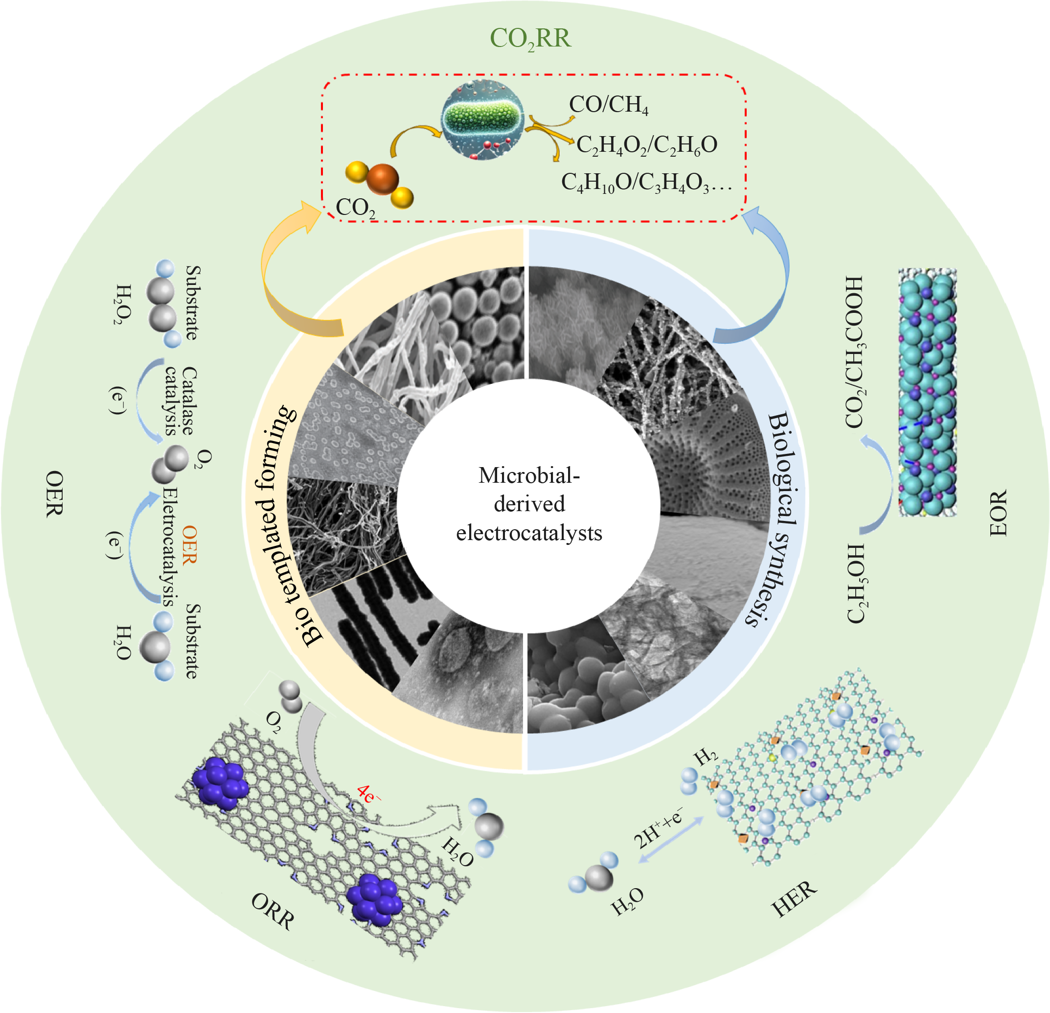 With the increasing global demand for sustainable energy and environmental solutions, the development of efficient, cost-effective, and eco-friendly electrocatalysts has become a key area of research. Microorganisms, with their distinctive microstructures, abundant functional groups, and diverse metabolic activities, offer innovative pathways for the green synthesis of electrocatalysts. This review first systematically summarizes microbial-derived electrocatalysts by using microorganisms (bacteria, fungi, viruses) as templates and metabolites, e.g., extracellular polymers, bacterial cellulose as mediates, and their applications in various representative electrocatalytic reactions, including hydrogen evolution reaction, oxygen evolution reaction, and oxygen reduction reaction. We then particularly focus on the application of microbial-derived electrocatalysts in CO2 reduction reaction. Microorganisms not only serve as structural templates to impart high surface areas and ordered pores to catalysts but also facilitate the introduction of active sites through metabolic processes, significantly enhancing catalytic efficiency toward the optimization of reduction products. Finally, the current challenges as well as future optimization strategies are proposed in the field of microbial-derived electrocatalysts. This work offers a guideline for the design of microbial-mediated catalytic materials, advancing new strategies toward achieving carbon neutrality.